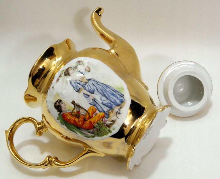 Предмет аукциона — красивый старинный кувшин из белого фарфора, украшенный сценой с обеих сторон и позолоченный.