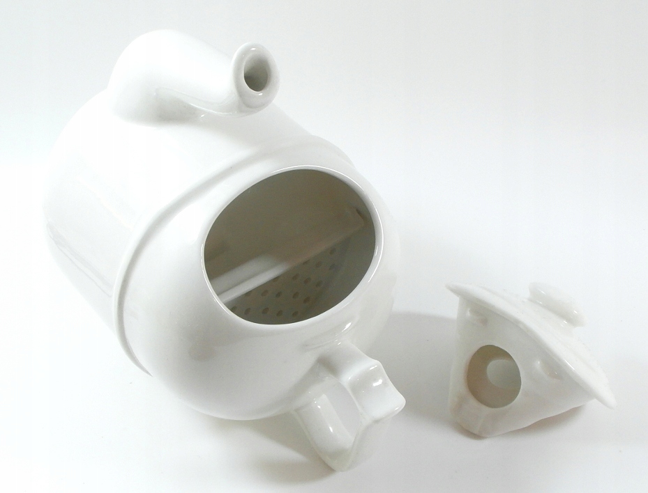 Предмет аукциона — красивый старинный кувшин-чайник-заварник, выполненный из белого фарфора. Конечно, очень редкая вещь. В крышке есть отверстие для подвешивания пакетика или ситечка с чаем, центр разделен внутренним ситом, в положении как на фото справа насыпанная в воду трава не попадает в воду, и после постановки кувшина остается на сите.