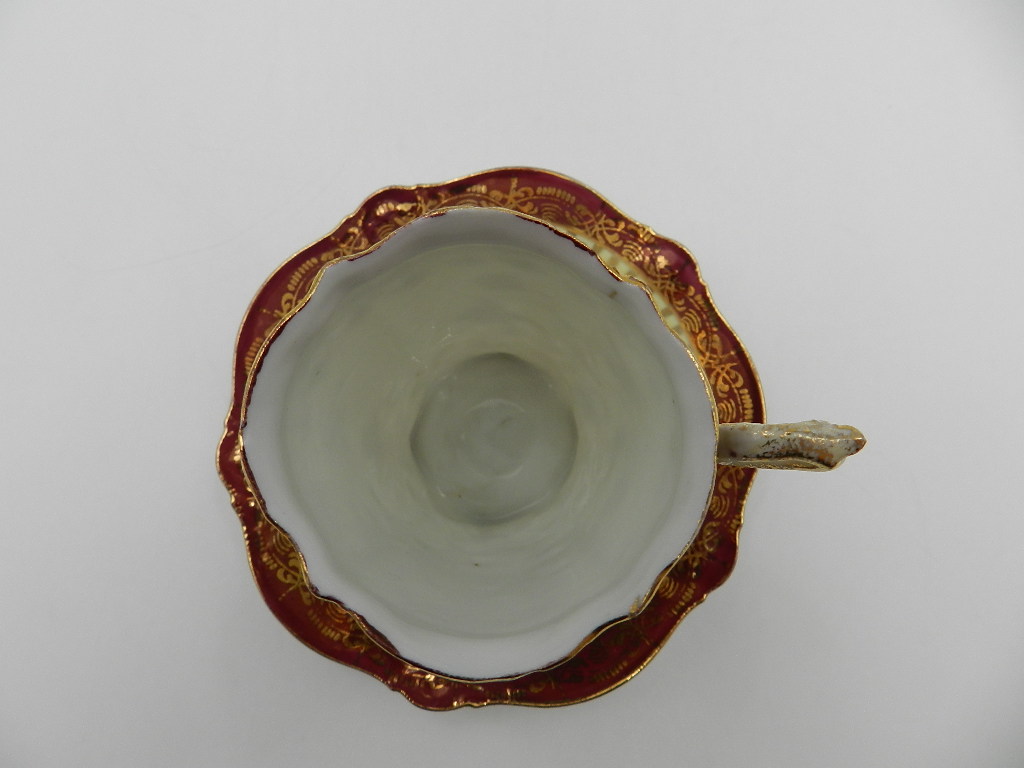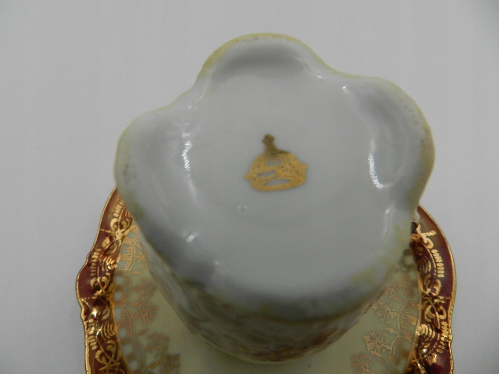 Очень хорошее состояние. Незначительные потертости позолоты. Линия внутри чашки рядом с наполнителем, видимая на фотографиях, — это золотая краска, вероятно, нанесенная случайно, а не трещина или дефект.