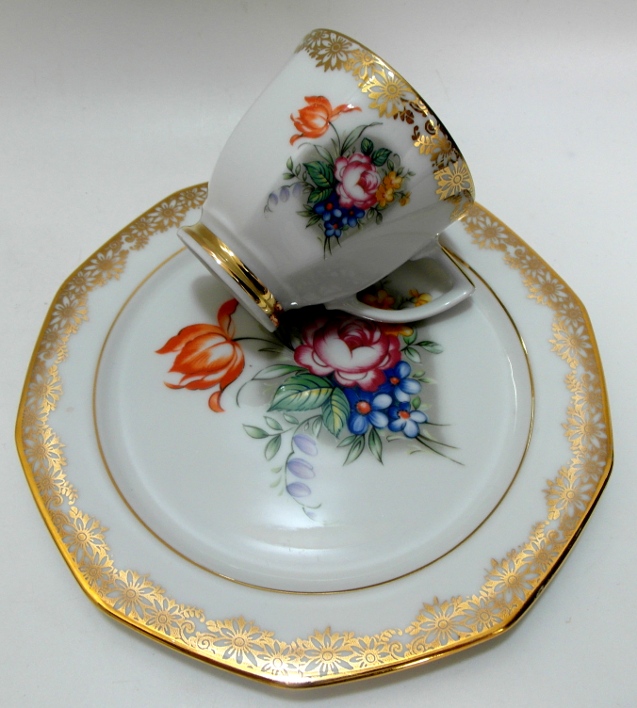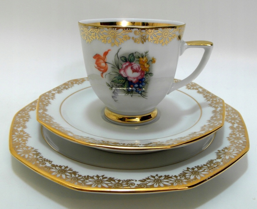 Предмет аукциона — красивый старинный сервиз для завтрака. Белый фарфор, украшенный цветами и золотом - брелок, маленький черный.
