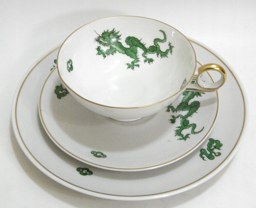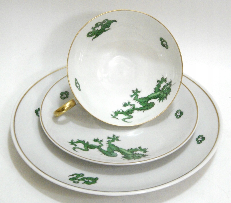 Красивый, старинный набор для завтрака, выполненный из белого фарфора, украшенный зелеными драконами.