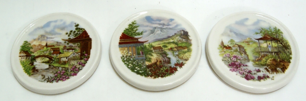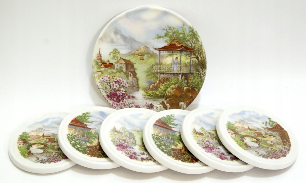 Предмет аукциона - красивый набор из 6+1 подставок, набор выполнен из белого фарфора, украшен пейзажами - три разные картинки, две подставки с одинаковыми декор.
