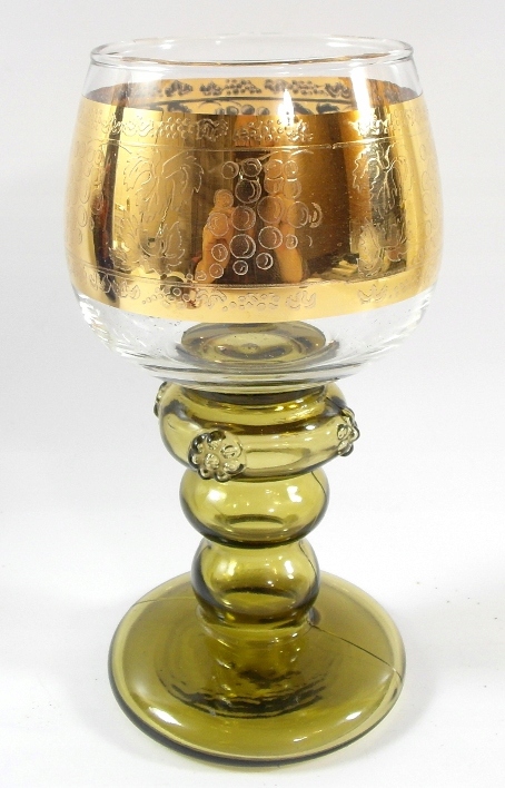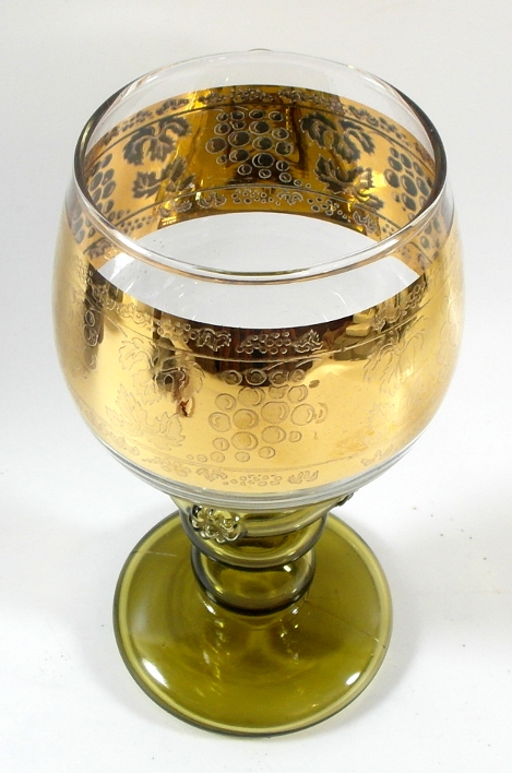 Красивый старинный стакан из тонированного в массе бесцветного хрусталя. Стакан украшен широким гравированным узором и позолотой. Аукцион из нескольких предметов.