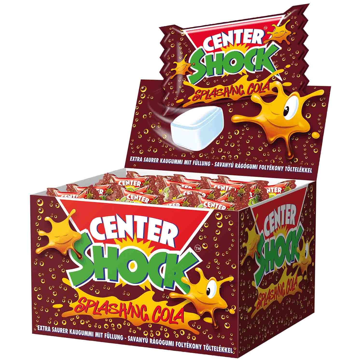 Благодаря Center Shock Splashing Cola перекусы становятся вкусным минным полем. Вкусные жевательные резинки чрезвычайно кислые и обеспечивают множество вкусовых ощущений. Откусите его и почувствуйте насыщенный жидкий вкус и освежающий вкус колы, который идеально дополняет конфетную бомбу. Попробуйте и нажмите на курок, если осмелитесь.