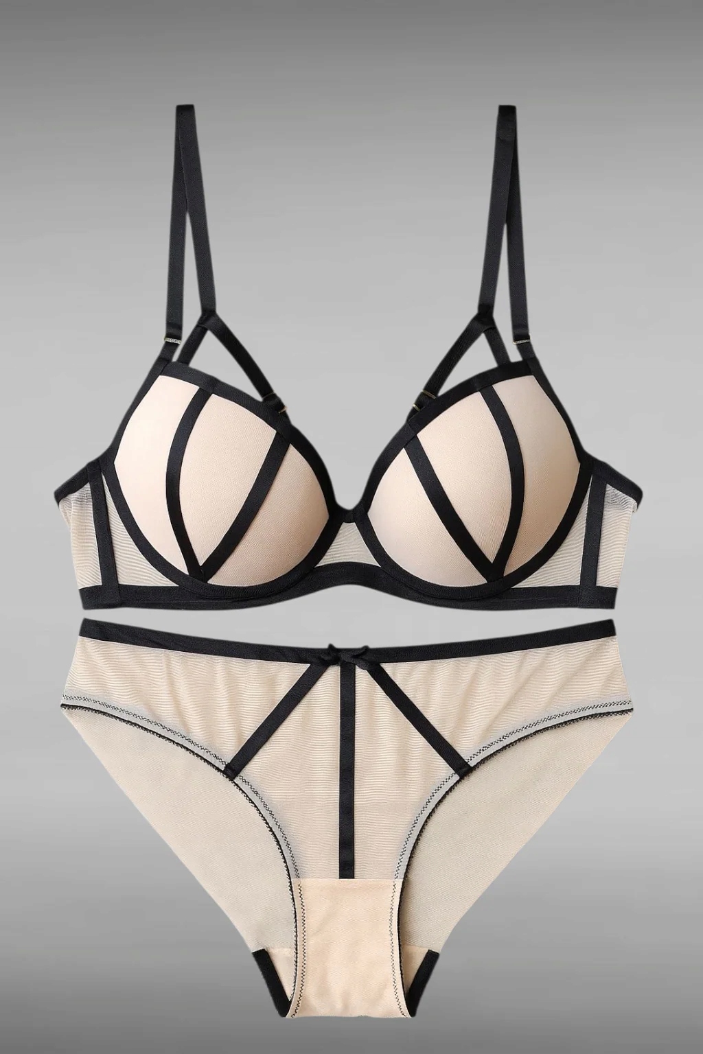 Современный комплект, в котором встроенный пуш-ап четко приподнимает и собирает бюст, а телесная сетка с белой окантовкой рисует на коже изящную геометрию. Эффект: более тонкая талия, подчеркнутый вырез и абсолютный гламур.