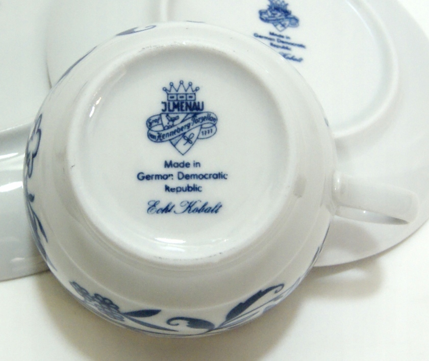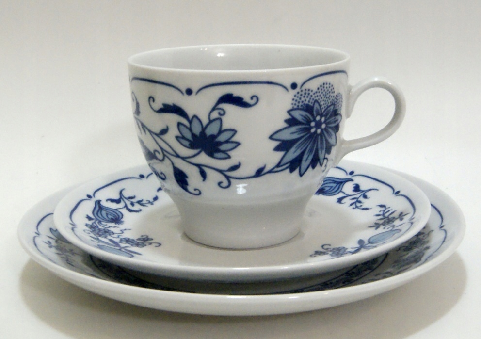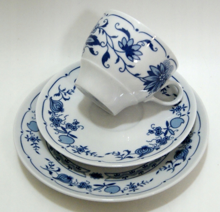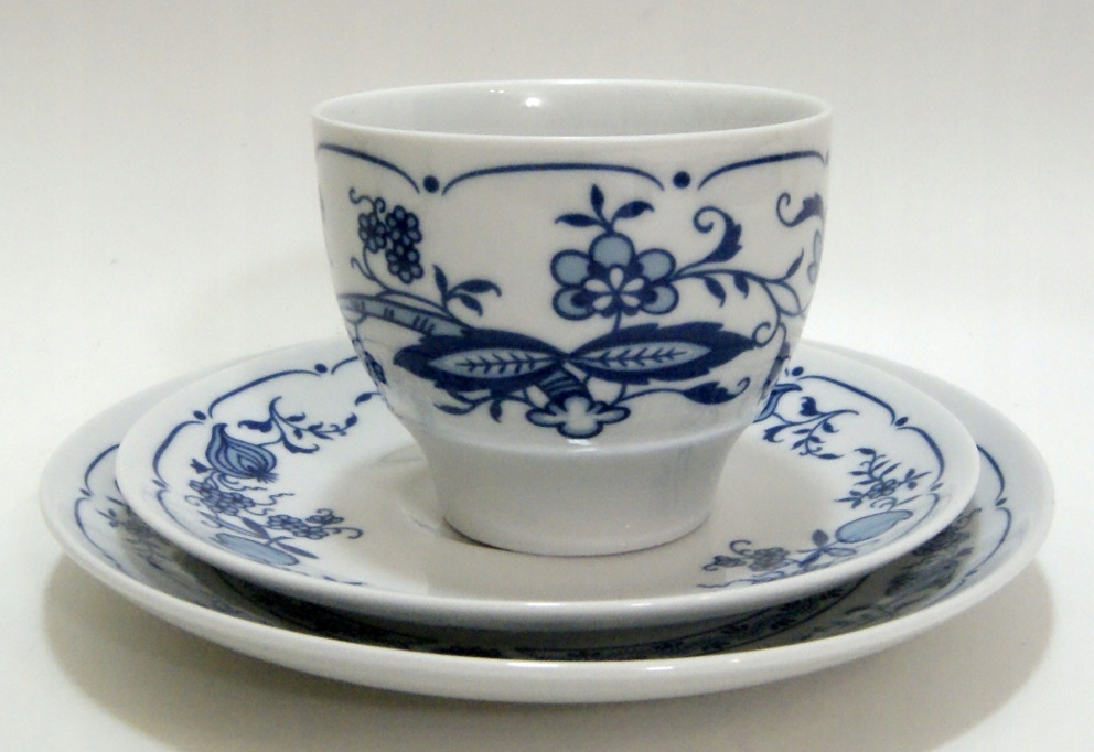 Набор для завтрака изготовлен из красивого белого фарфора, украшенного узором в виде кобальтово-синей луковицы.