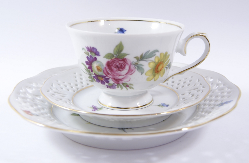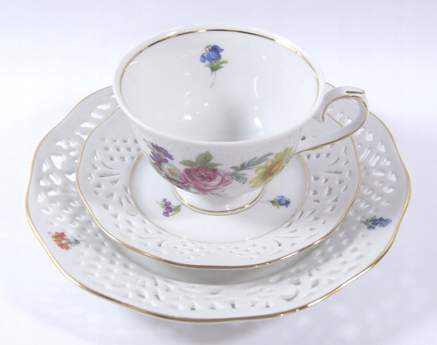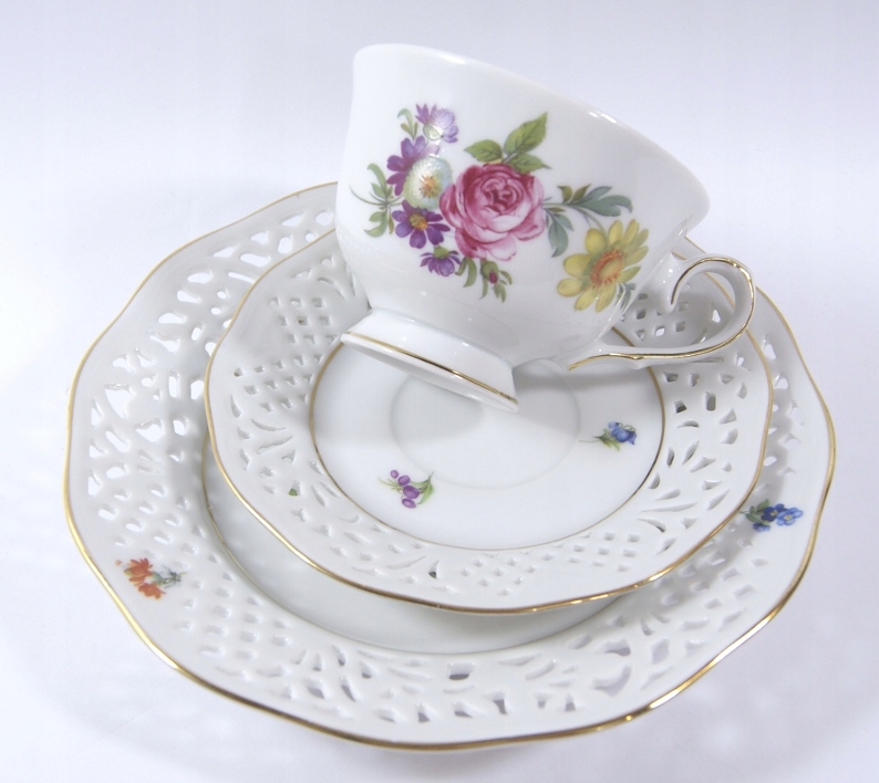 Предмет аукциона - красивый, старинный сервиз для завтрака - белый фарфор, украшенный позолотой, ажуром и цветами.