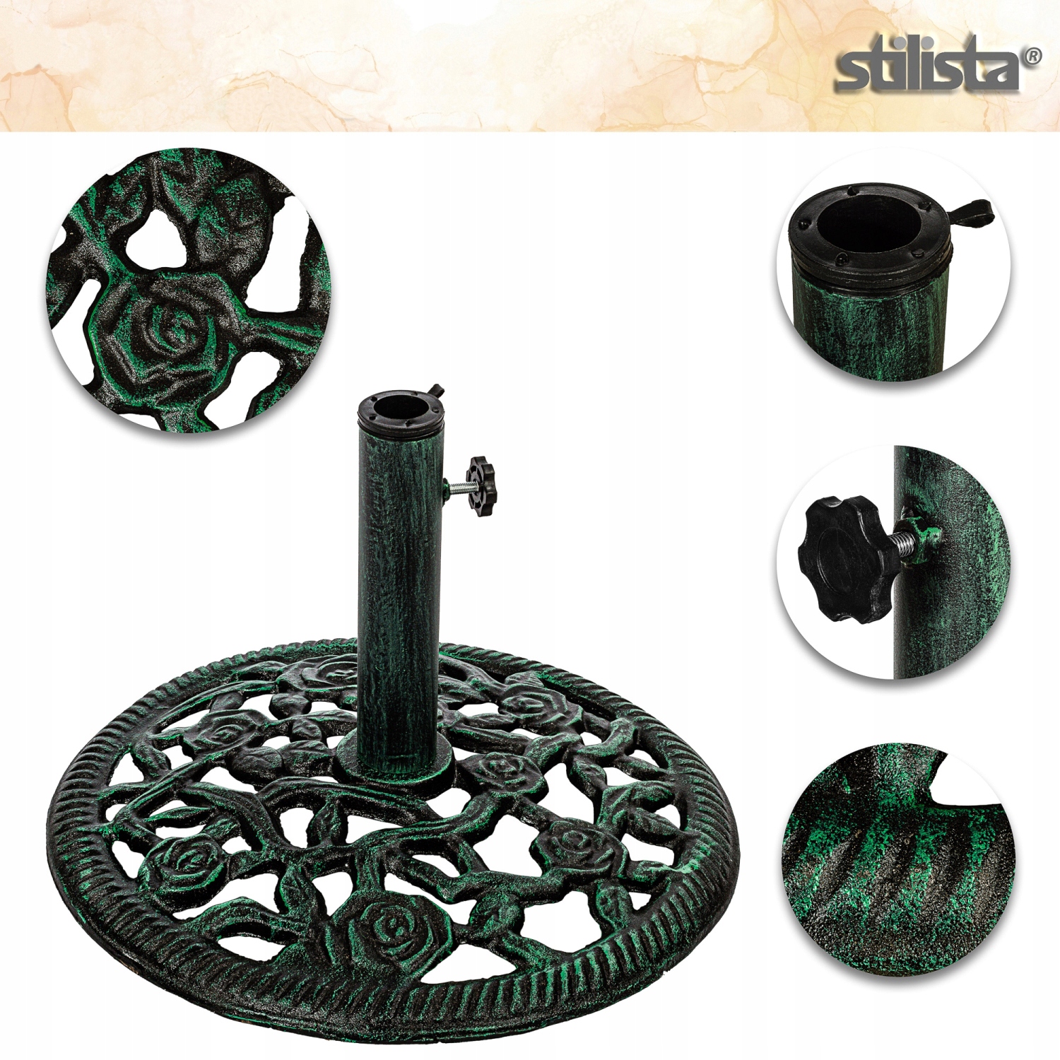 Подставка для зонтов марки STILISTA® изготовлена из чугуна и служит для крепления стойки зонта, обеспечивая его устойчивость. Благодаря адаптеру, входящему в комплект, его можно использовать для зонтов с диаметром ножек 38–48 мм. Чугунное основание имеет красивый узор из лепестков роз, что делает его настоящим украшением вашего сада или другого помещения.