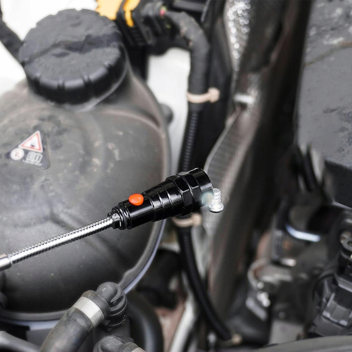 - Выдвижной стержень, гибкая шейка, магнитная головка и основание. Магнитные наконечники позволяют подбирать шайбы, болты, гайки или болты, когда вам нужна третья рука.