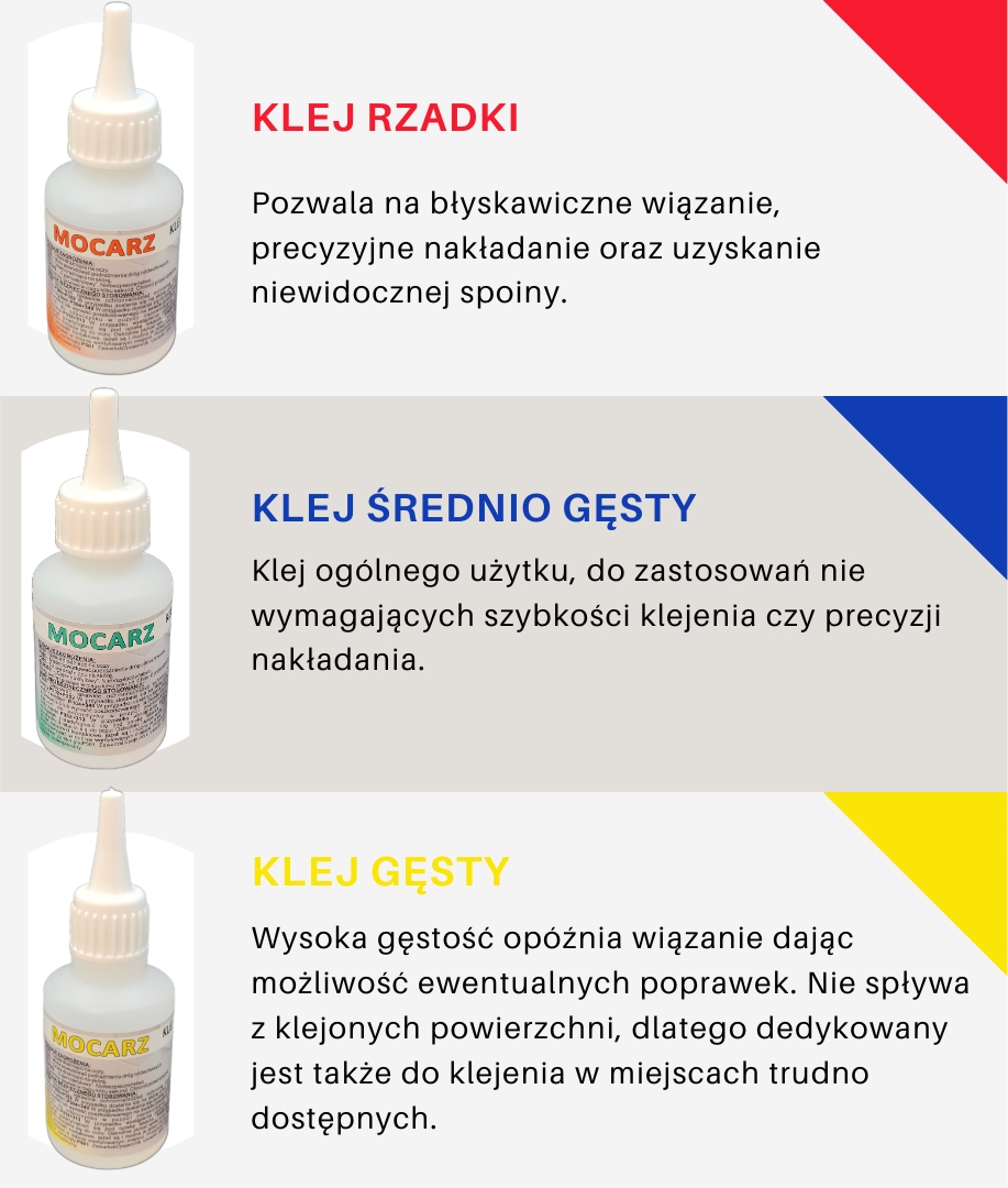 Серия Mocarz представляет собой практичные однокомпонентные моментальные клеи. Они характеризуются коротким временем схватывания и широким спектром применения. Они идеально подходят для склеивания дерева, металла, стекла, керамики, большинства пластиков, резины, фарфора, кожи, бумаги и картона.
