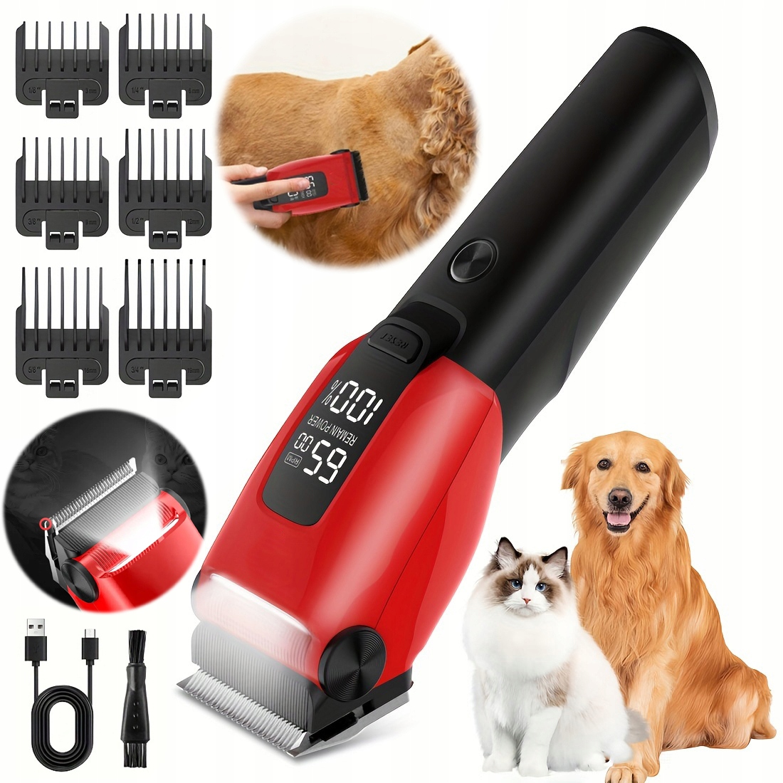 оснащен интеллектуальным светодиодным дисплеем, уровнем батареи и тока, четко видны, что позволяет отслеживать текущее состояние в любое время. Немедленно включен диод, позволяющий точно наблюдать за волосами животных, что обеспечивает более точную обрезку. Трехмерный металлический корпус с трехмерным дизайном обеспечивает удобную сцепление и сводит к минимуму усталость во время длительного использования. Простые кнопки верхней/вниз позволяют легко переключать передачи.