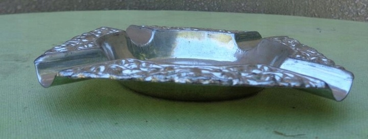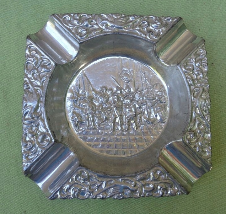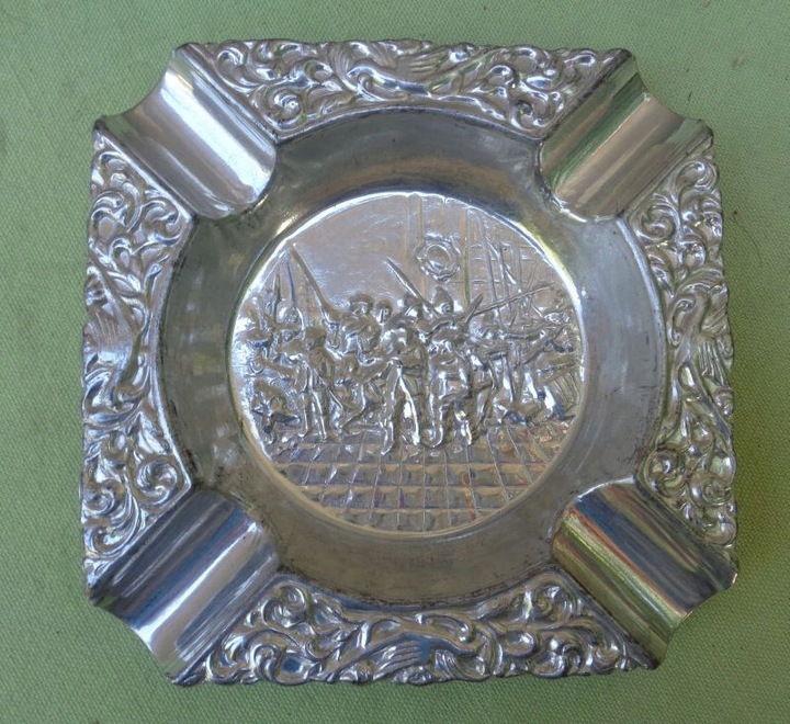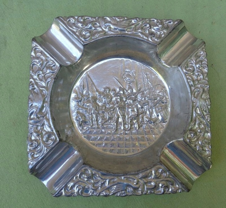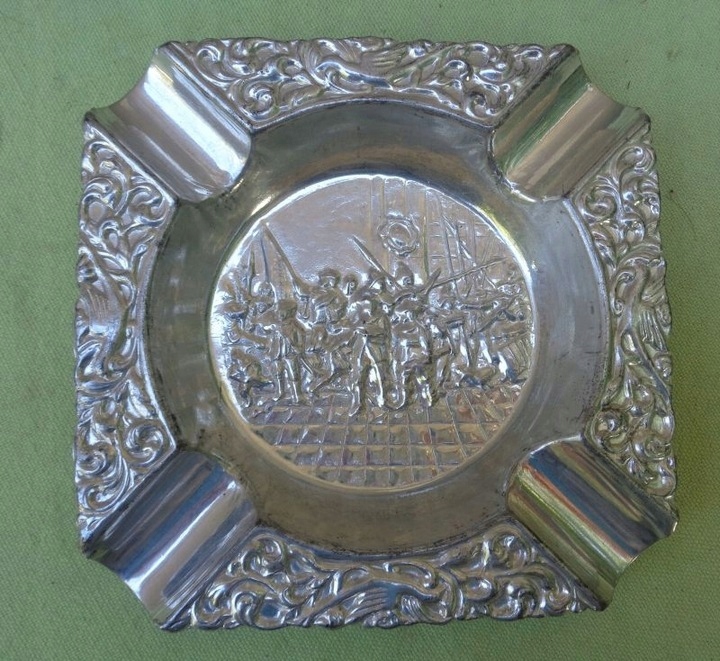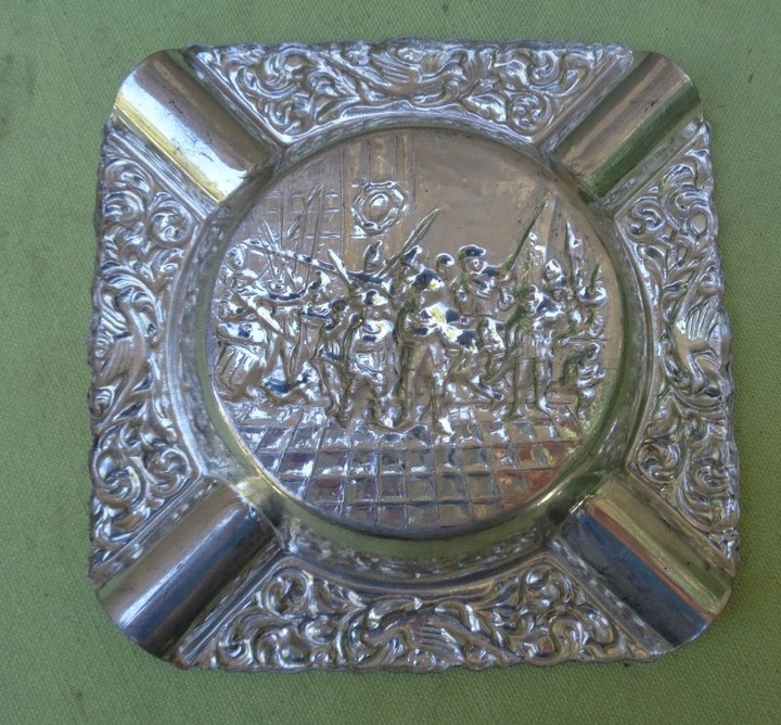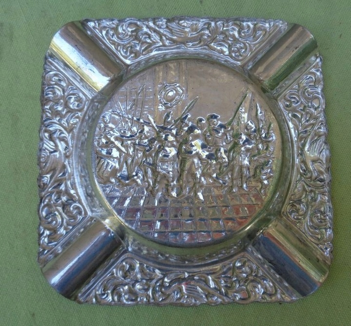 Интересная, богато декорированная пепельница. Центральную часть экспозиции украшала военная сцена. Там была изображена группа вооруженных людей. Края пепельницы были украшены натуралистичным орнаментом в виде растений и птиц. Экспонат выполнен из плакированного металла. Всем рекомендую.