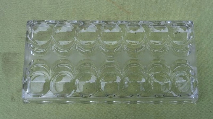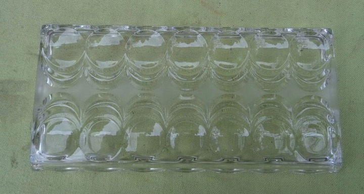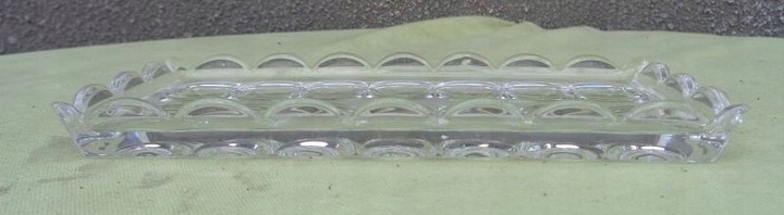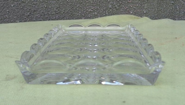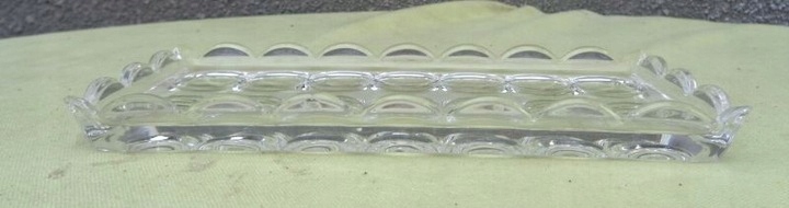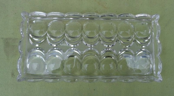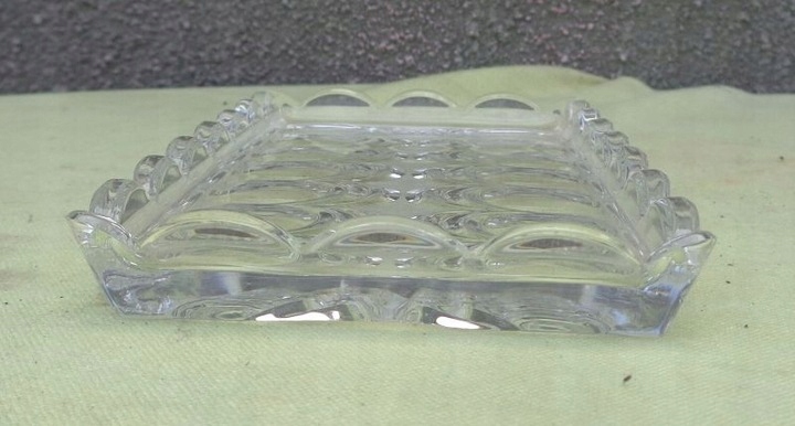 Интересная, интересная стеклянная тарелка 1950-х годов. Край тарелки высокий и интересно загнутый. Тарелка внизу украшена интересными кружочками. Круги были сделаны с большой точностью и аккуратностью. Подставка для торта имеет минимальный скол, как показано на фотографиях. Всем рекомендую.