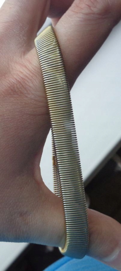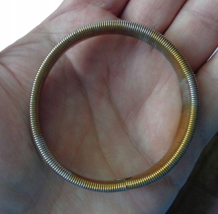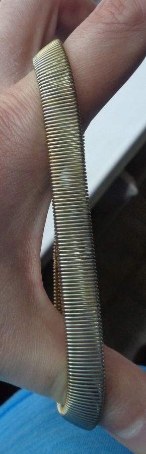 Интересный, интересный браслет из 1960-х годов. Экспонат выполнен из позолоченного металла. На браслете видны остатки позолоты. Браслет состоит из равномерно соединенных звеньев. Звенья расширяются и естественным образом ложатся в руку. Экспозиция подойдет к любому случаю. Всем рекомендую.