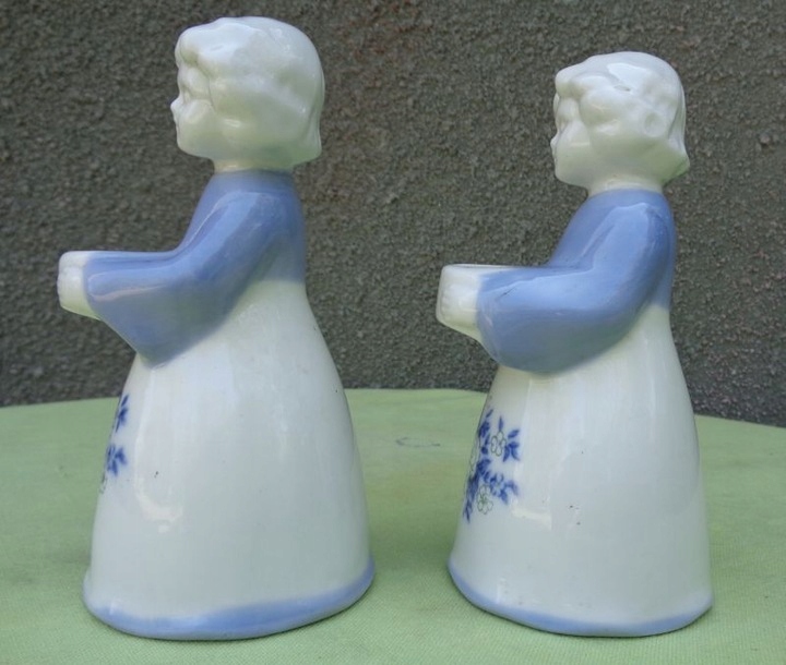Интересные, интересные односвечные фарфоровые подсвечники. Подсвечники были выполнены в виде женщин, держащих в руках сосуды со свечами. Экспонаты были расписаны подглазурной росписью. Спереди женские платья были украшены красивыми подглазурными букетами цветов, расписанными вручную. Гора также была окрашена в синий цвет. Фарфор без повреждений. Всем рекомендую.