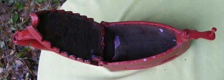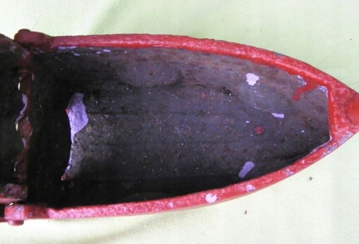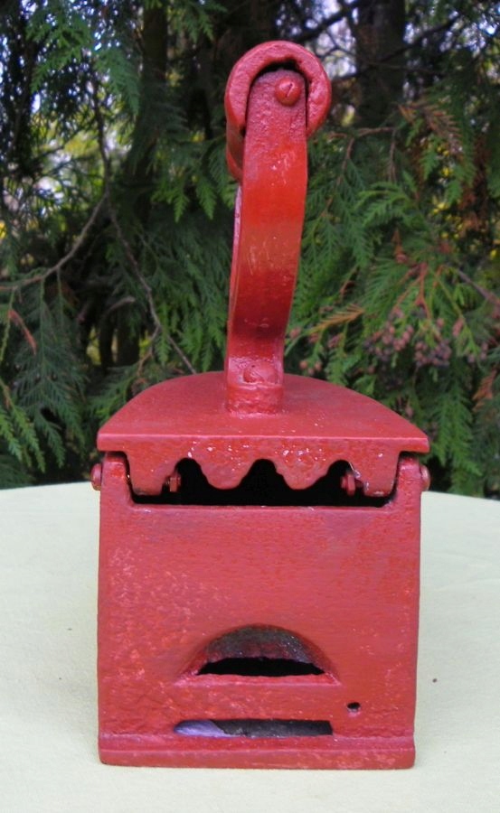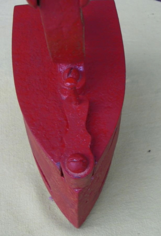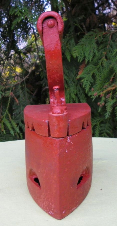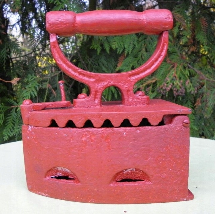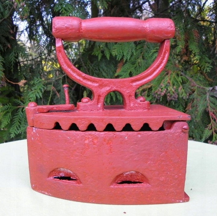 Интересный, интересный, коллекционный угольный утюг 1860-1880 годов. Экспонат был изготовлен из чугуна. Для защиты его покрасили красной краской. Утюг имеет оригинальную деревянную ручку. Экспонат подписан, подпись видна на фотографиях. Спереди имеется подвижный замок, который фиксирует верх. Рекомендую коллекционерам.