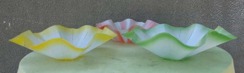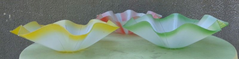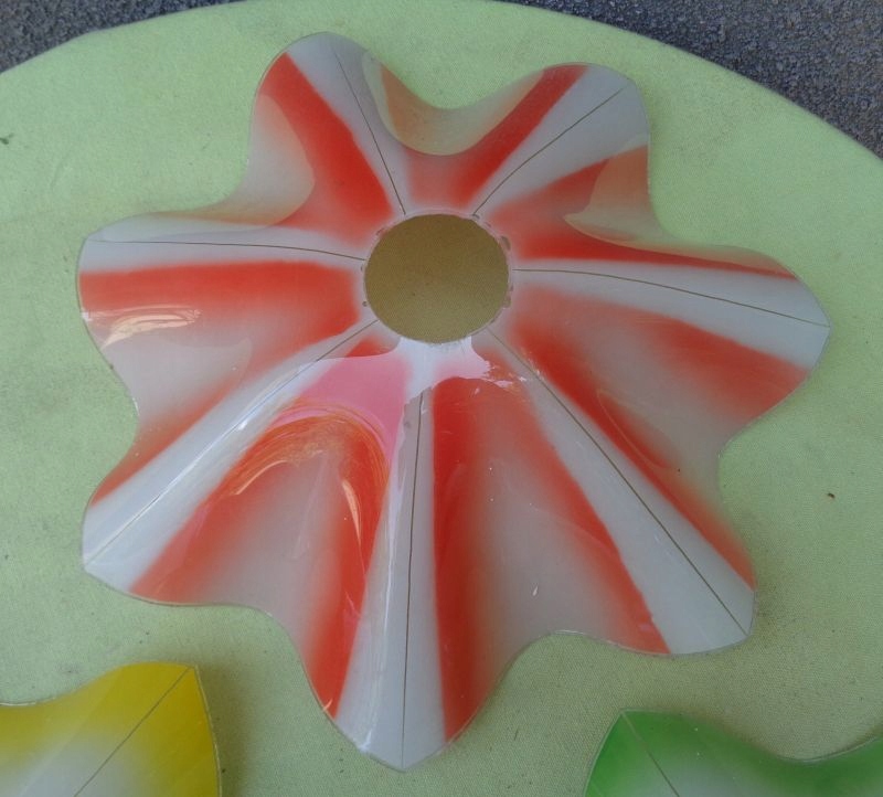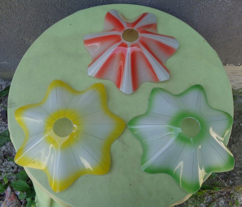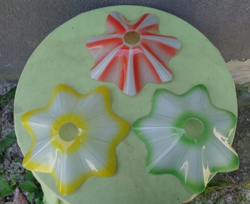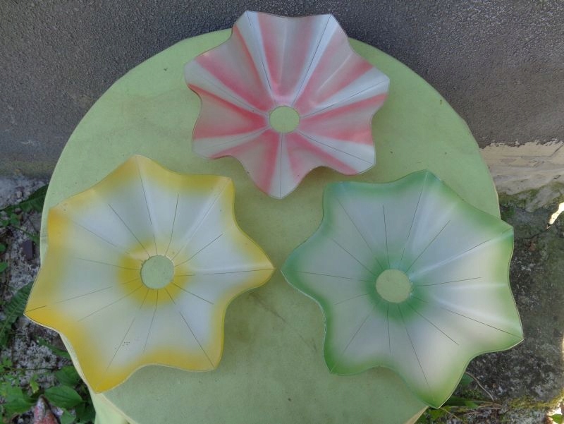 Интересные три ярких плафона люстры 1960-х годов. Абажуры имеют интересную волнистую структуру. Два абажура имеют цветное стекло по краям и посередине. Дополнительно они украшены интересными полосками, украшающими стеклянную поверхность. Третий абажур имеет розовую стеклянную поверхность. Он также украшен изящными полосками. На одном из абажуров имеется небольшое повреждение стекла, что видно на фотографиях. Всем рекомендую.