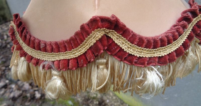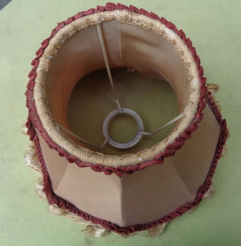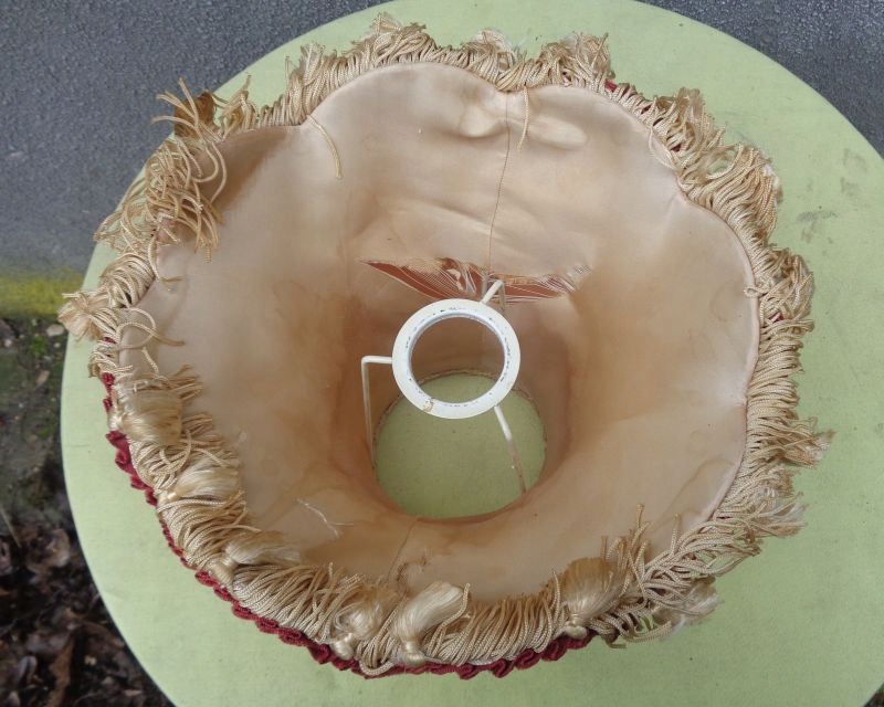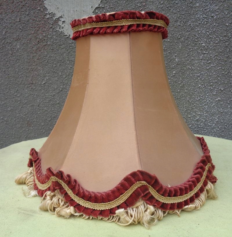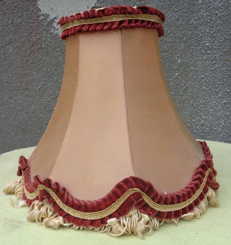 Интересный, элегантный абажур из богатого материала для кабинетной лампы 1960-х годов. Экспонат выполнен из интересно окрашенного материала. Низ абажура украшен интересной полоской плиссированного материала и интересной бахромой. Верх также украшен интересной плиссированной полоской материала. На внутренней стороне абажура имеется надрыв материального покрытия, что видно на фотографиях. Всем рекомендую.