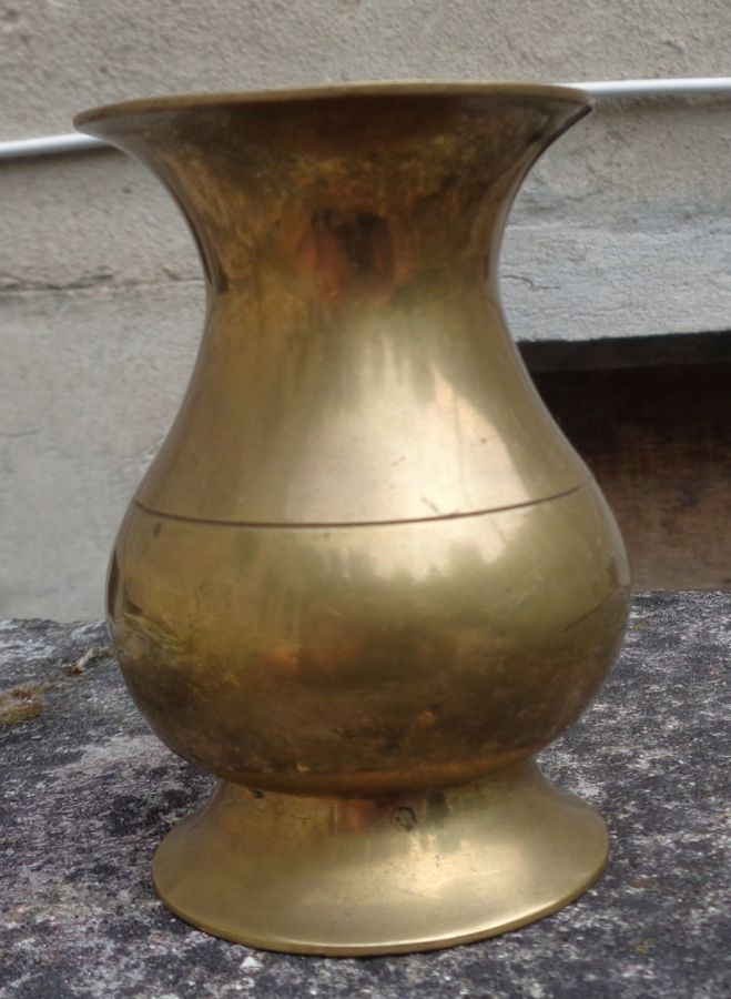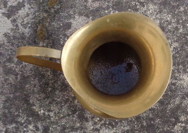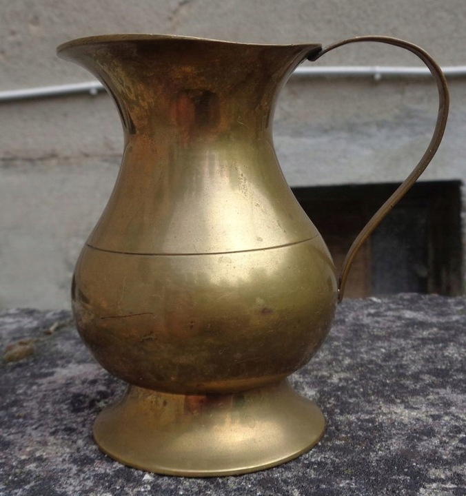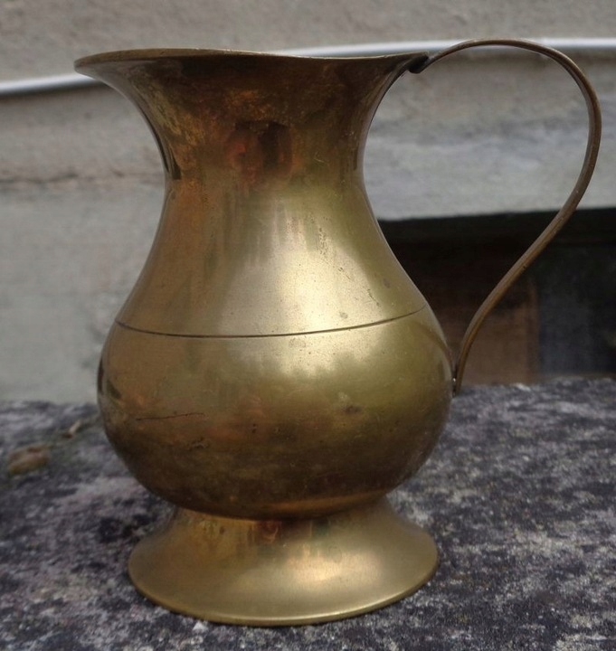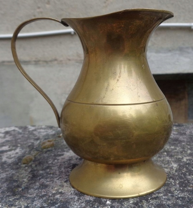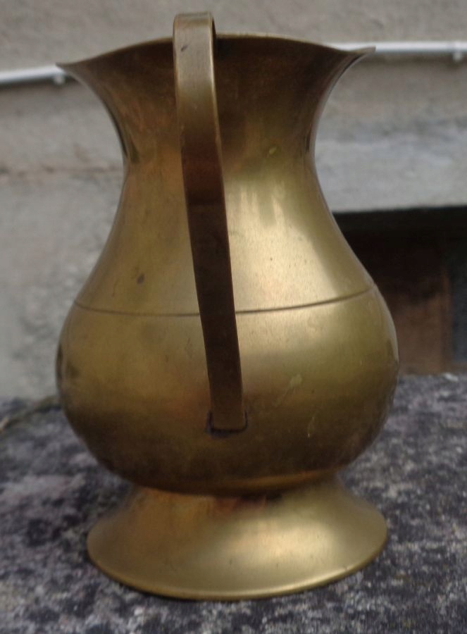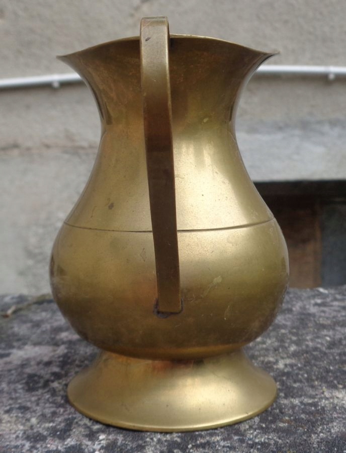 Интересный кувшин для воды из латуни. Экспонат имеет интересную круглую основу. Центральная часть чаши экспоната слегка выпуклая и сужается к верху. В центральной части чаша украшена бегущими по кругу линейными орнаментами. Верхняя часть экспоната имеет нежную, классическую форму. Кувшин имеет ручку изящной формы. Всем рекомендую.