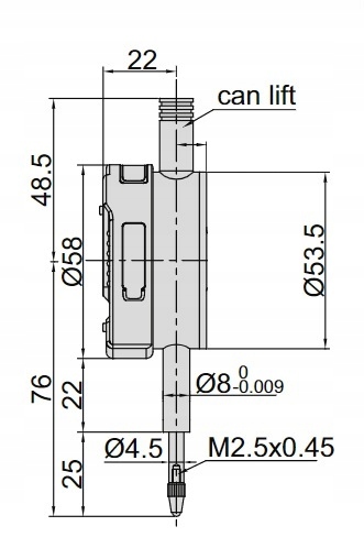 Электронный измерительный датчик с цифровым дисплеем, диапазон измерения 0-12,7 мм/0,5 дюйма и разрешение 0,01 мм/0,0005 дюйма. Оснащен разъемом для вывода данных. Поставляется с задней стенкой и ручкой.