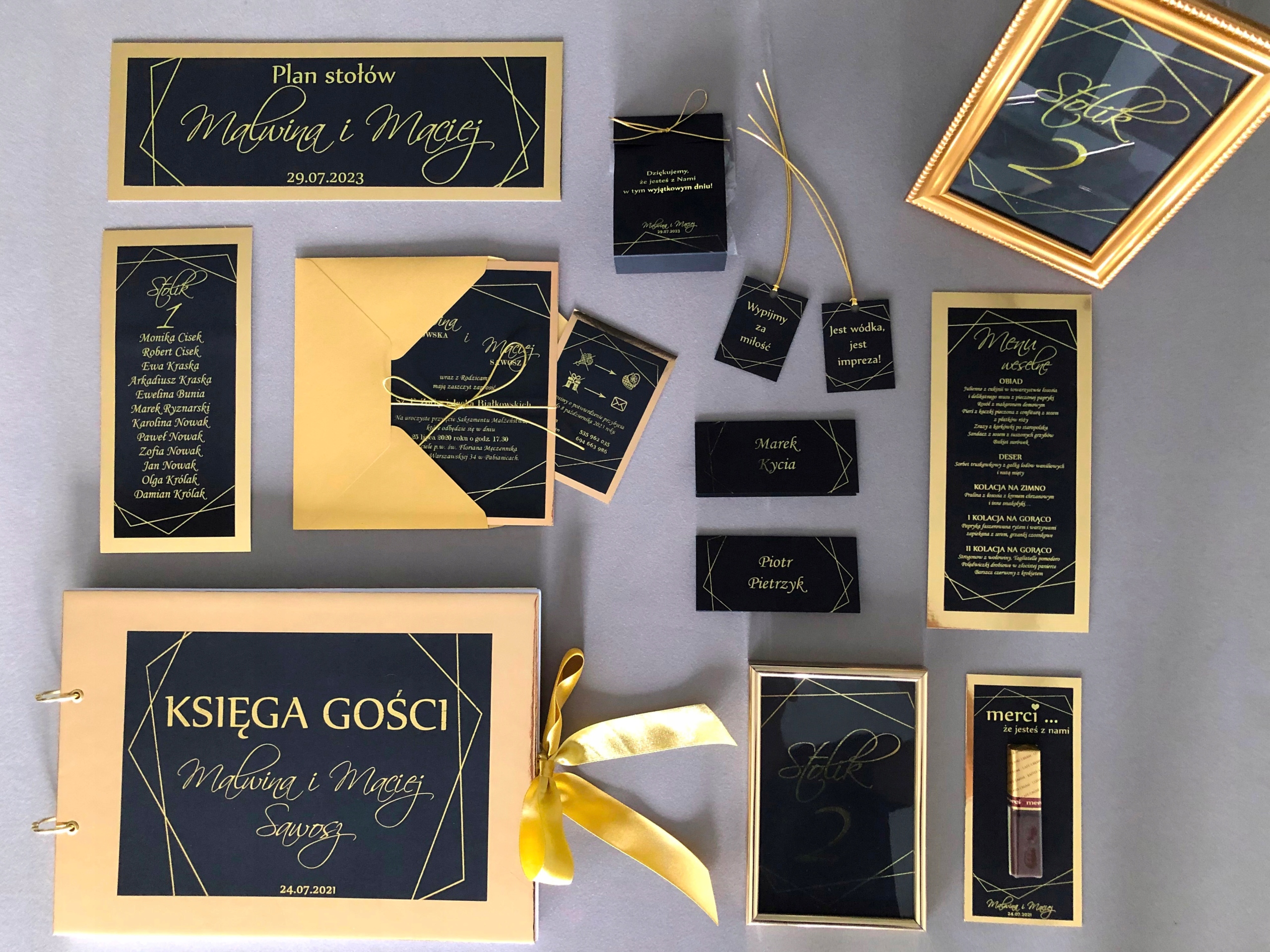 Коллекция ONYKS представляет собой сочетание два цвета: черный и польский злотый. Весь комплект выделяется среди других тем, что он современен и уникален среди других коллекций. Все элементы коллекции выполнены на черной бумаге, с золотой зеркальной поверхностью и отделаны золотыми зеркальными буквами. Сочетание этих двух цветов делает их оригинальными и современными среди свадебных украшений. Свадебные украшения ручной работы, сделанные нами, станут прекрасным украшением и произведут впечатление на ваших гостей.