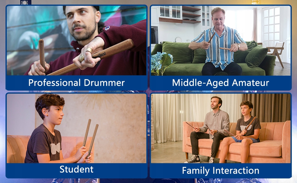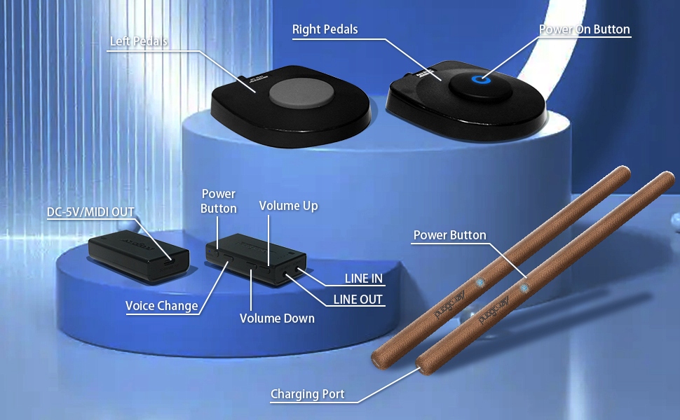 ✅Процесс настройки максимально упрощен — достаточно включить стики, соединить их с устройством и выполнить короткую калибровку, чтобы система точно распознавала положения и движения рук во время игры. После настройки пользователю доступен полный набор перкуссионных элементов, таких как малый барабан, томы, хай-хэт или тарелки, а датчики педалей реалистично воспроизводят работу ног.