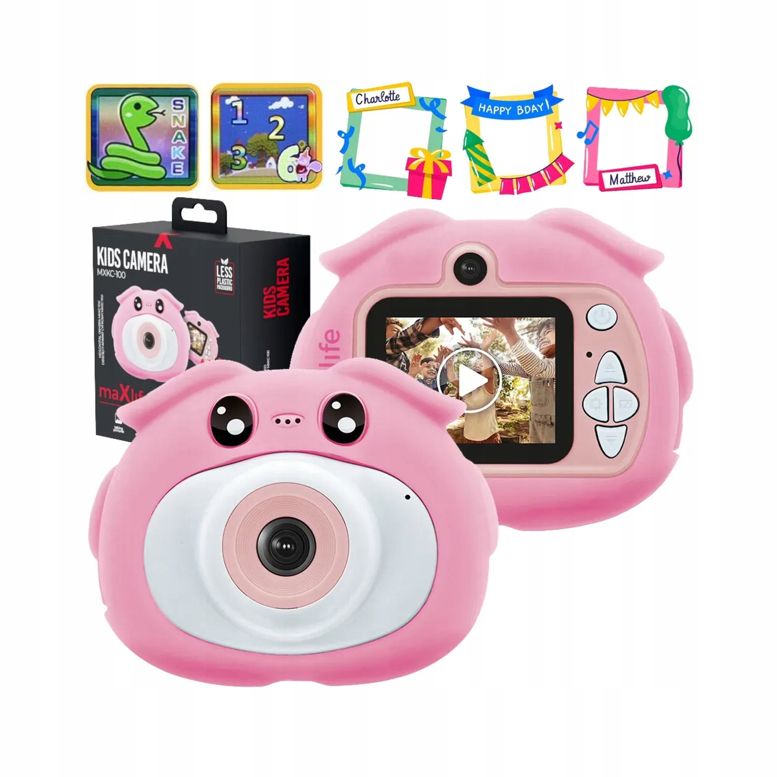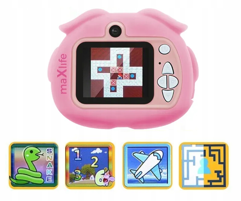 Камера предназначена не только для фотографирования и записи фильмов. Камера имеет встроенный -большой выбор красочных фильтров и забавных фото -красот. Кроме того, камера была оснащена 5 играми: змея, нажмите коробку, лабиринт, 1024, борьба. Это небольшое устройство сочетает в себе образование с удовольствием. Простая работа и высокое качество фотографий, побуждаемые играть и развивать чувство детей.