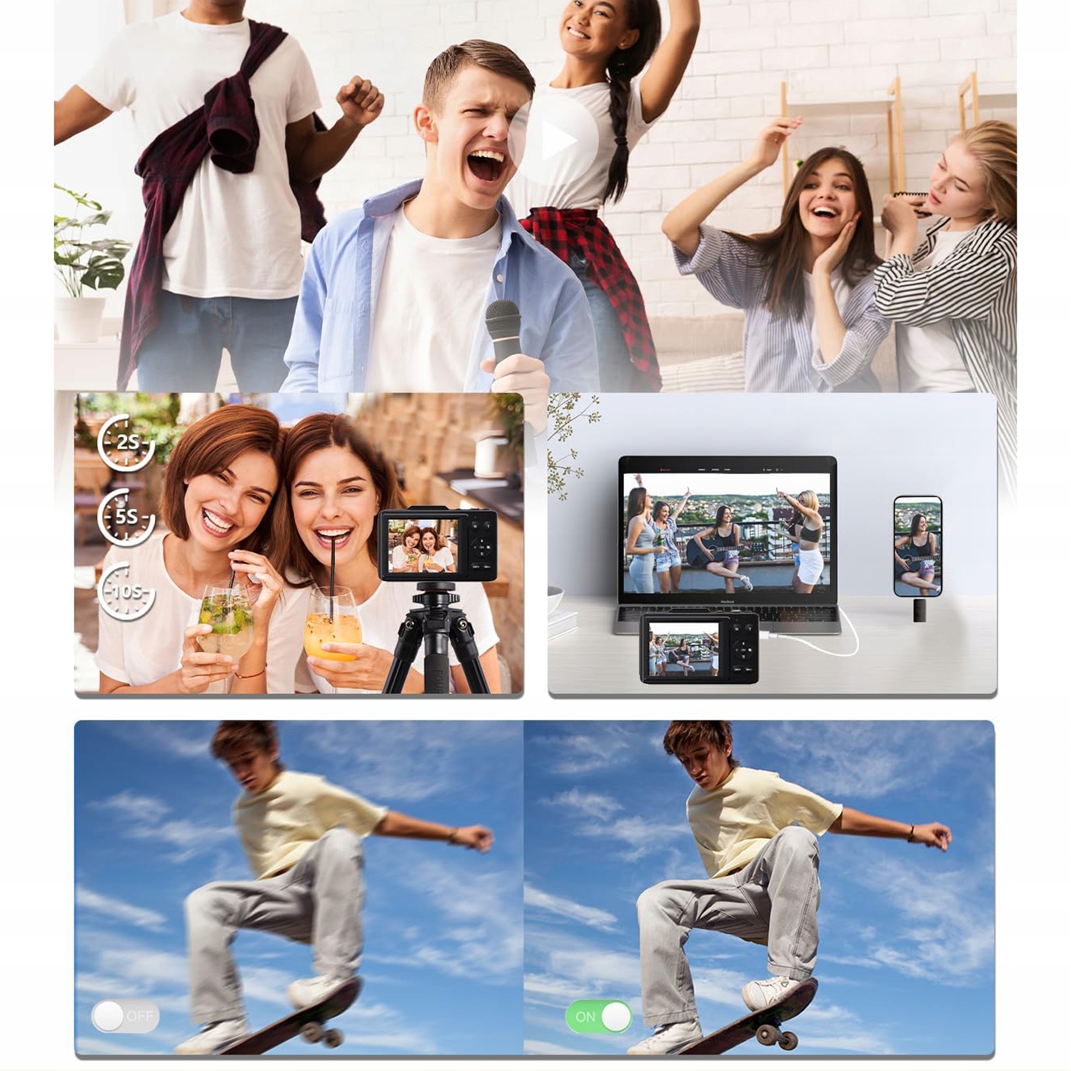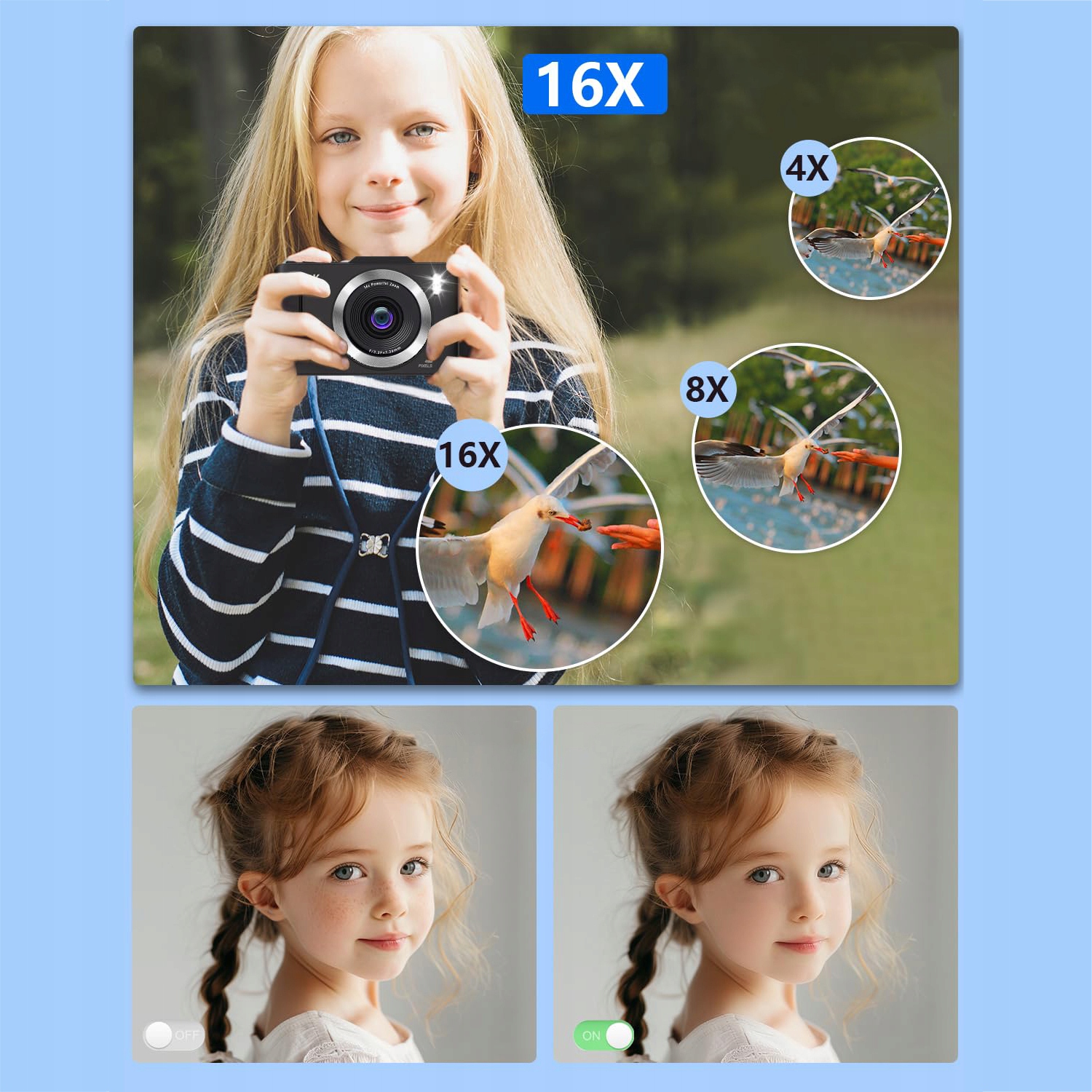 Цифровая камера оснащена новейшим CMOS-датчиком изображения и 5-осевой стабилизацией, обеспечивая четкое видео в формате Full HD 1080P и фотографии с разрешением 48 МП. Он имеет макрорежим, который позволяет четко фотографировать цветы, растения или мелких насекомых. Камерой для детей и подростков можно легко управлять, не требуя сложной настройки, и она идеально подходит для развития их интереса к фотографии и запечатления счастливых моментов на вечеринках, поездках в отпуск и любых небольших приключениях.