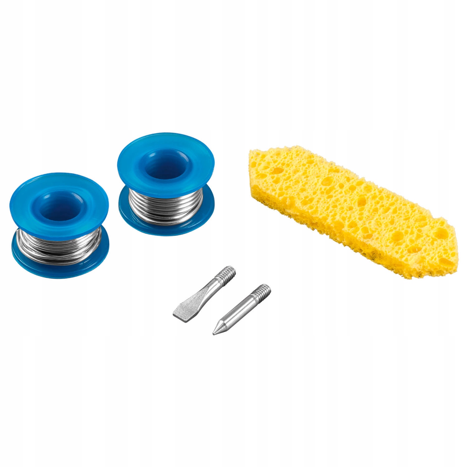 В комплекте аксессуары: 3 жала для пайки (одно уже установлено), 2 катушки с припоем (толщина 1,5 мм / 1,0 мм), 1 губка для пайки