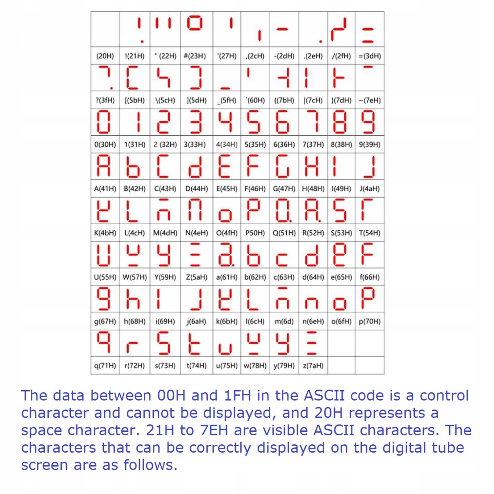 Как использовать: данные от 00H до 1FH в коде ASCII являются управляющими символами и не могут быть отображены, 20H представляют собой пробел, а 21H–7EH являются видимыми символами ASCII. Следующие символы могут корректно отображаться на экране Nixie.