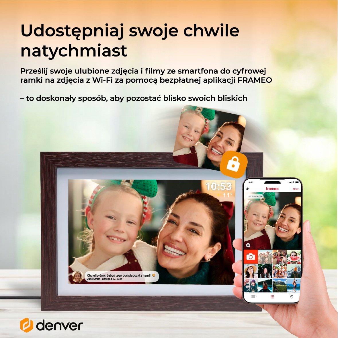 Цифровая фоторамка Denver с диагональю 10,1 дюйма, Wi-Fi и экраном IPS позволяет отправлять фотографии прямо со смартфона. Идеально подходит в качестве подарка и для ежедневного обмена воспоминаниями с семьей.