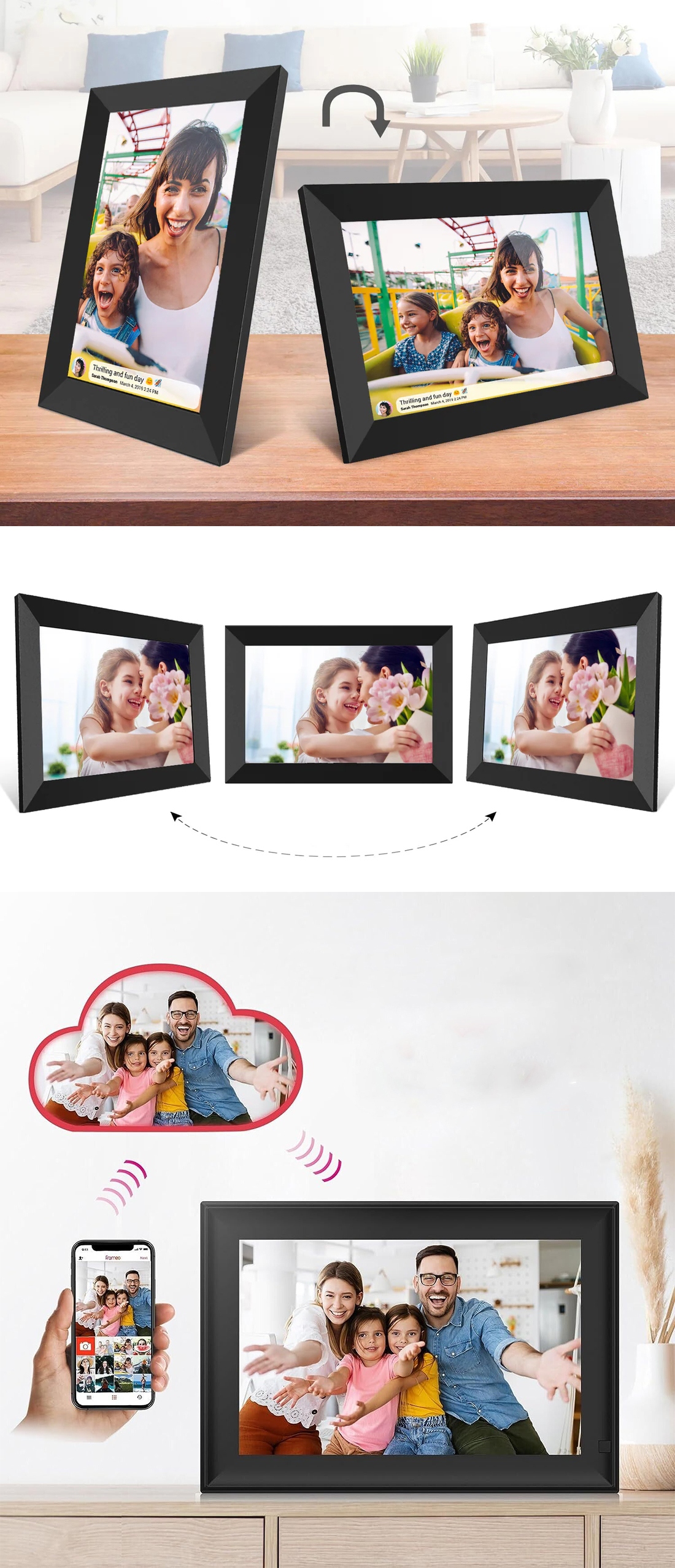 ✏️Функциональность: Рамку можно повесить на стену или разместить на столе/любой плоской поверхности в вертикальном или горизонтальном положении, благодаря прикручиваемой опоре и возможности поворота фотографий 360 градусов.