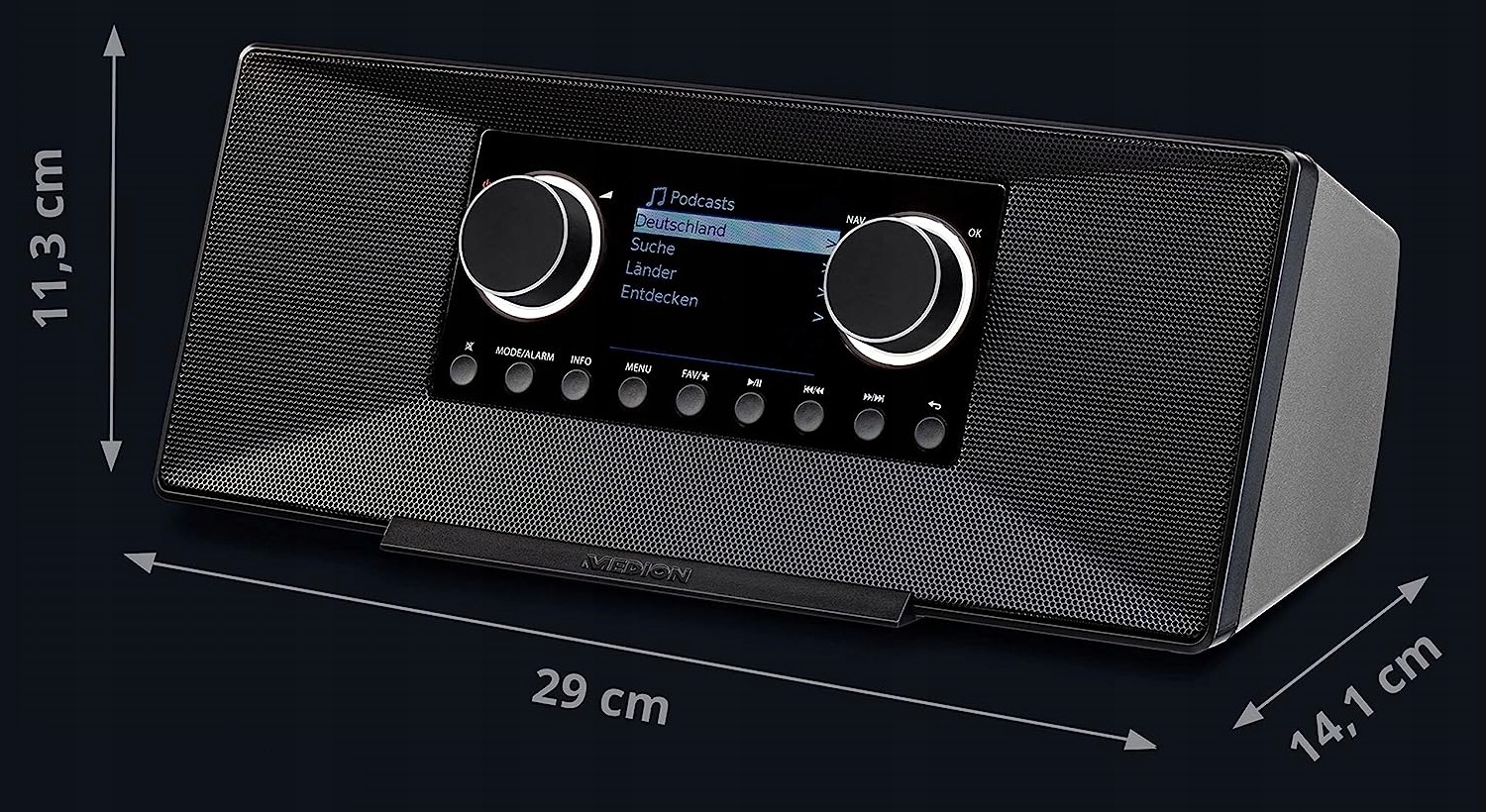 Интернет-радиоMedion MD89289 позволяет принимать радиостанции через традиционные каналы FM, DAB+ и Интернет. В случае интернет-радиостанций используется соединение WLAN 802.11 a/b/g/n. Передача может быть зашифрована с помощью WEP/WPA/WPA2 и позволяет принимать более 25 000 радиостанций и подкасты. Все, что вам нужно сделать, это подключить радио к Интернету. Альтернативой Wi-Fi также является стандартный интерфейс Ethernet LAN RJ-45 , позволяющий подключаться к Интернету через кабель. Обычные радиостанции принимаются через FM-тюнер или цифровое радио DAB+. С ресивером DAB+ вы можете принимать и воспроизводить радиопрограммы в более высоком качестве.