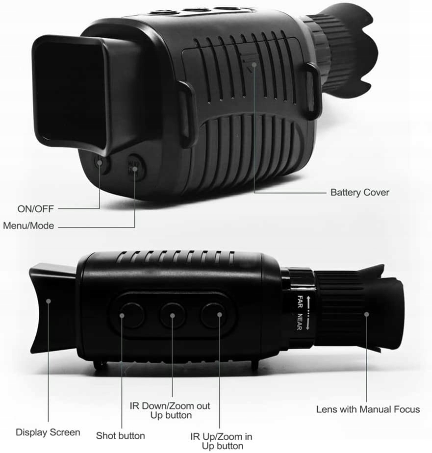 - Экран TFT с диагоналем 1,5 дюйма, легко смотреть и удобно; Поддерживает функцию воспроизведения видео, чтобы лучше использовать использование > 7-градусная регулирование яркости ИК. Расстояние наблюдения в общей темноте составляет около 150-1000 м и обеспечивает отличную видимость. Фильмы 1088 x 1088/30 FPS I и делайте четкие фотографии