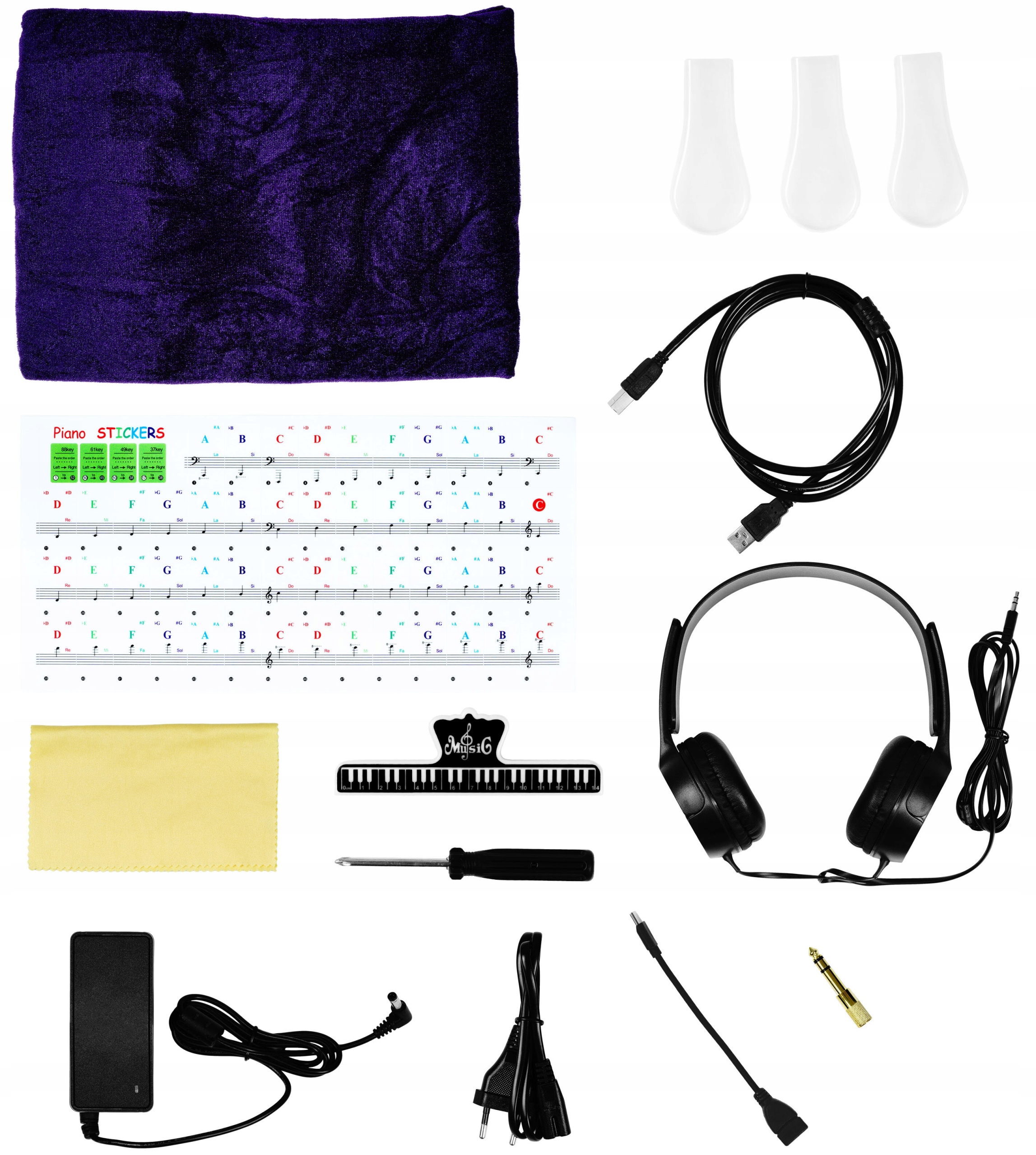 - Оборудование: Джек 3,5 мм-Джек 6,3 мм, OTG USB-A USB-C, примечания для нот, красочные наклеивания для ключей с нотами на штабе и соревнования по маркировке. Наушники, отвертка