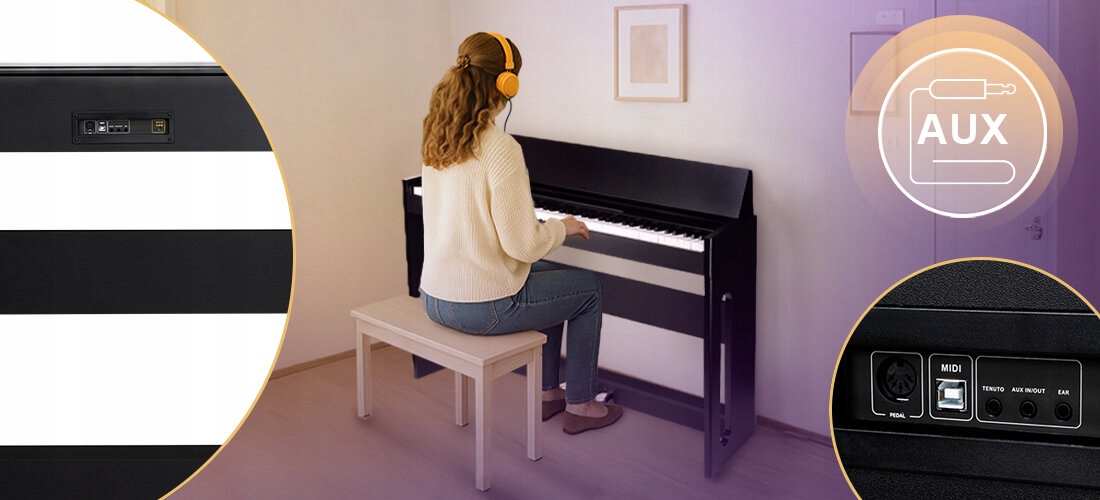 Musicmate P100-B Grandelegance предлагает Bluetooth для беспроводной передачи звука, ввода Aux, вывода наушников и функции MIDI для работы с компьютером и приложениями. Кроме того, Metronome, Transposition и 3-функциональная педали поддерживают науку и спектакли, а также встроенные динамики 2 x 20 W дают полный, пространственный звук.