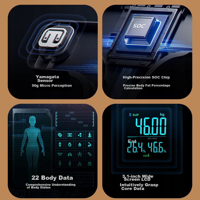 Цифровые внутренние весы для определения жира в организме с 22 показателями данных и большим экраном.