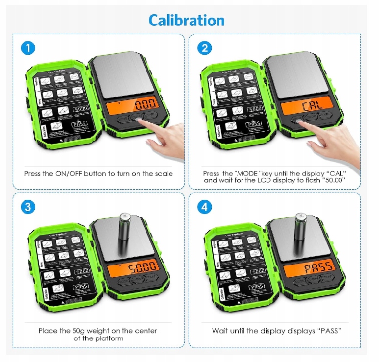 - С калибровочной гирей 50 г: простая калибровка для обеспечения точности. Идеально подходит для многих портативных задач взвешивания, таких как специи, ювелирные изделия, монеты, золото, лекарства, такие предметы, как серебро, монеты, порошок и т. д.