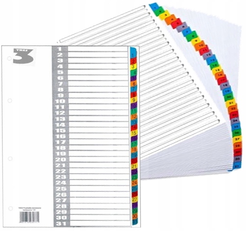 Разделители из белого жесткого офсетного картона плотностью 170 г/м2. Края ламинированы цветной полипропиленовой (майларовой) пленкой. Каждая вкладка отмечена номером, что упрощает поиск нужного контента. Они имеют описательный и информативный титульный лист. Универсальная перфорация, подходящая для любой папки. Благодаря им вы сможете эффективно организовывать и сортировать документы.