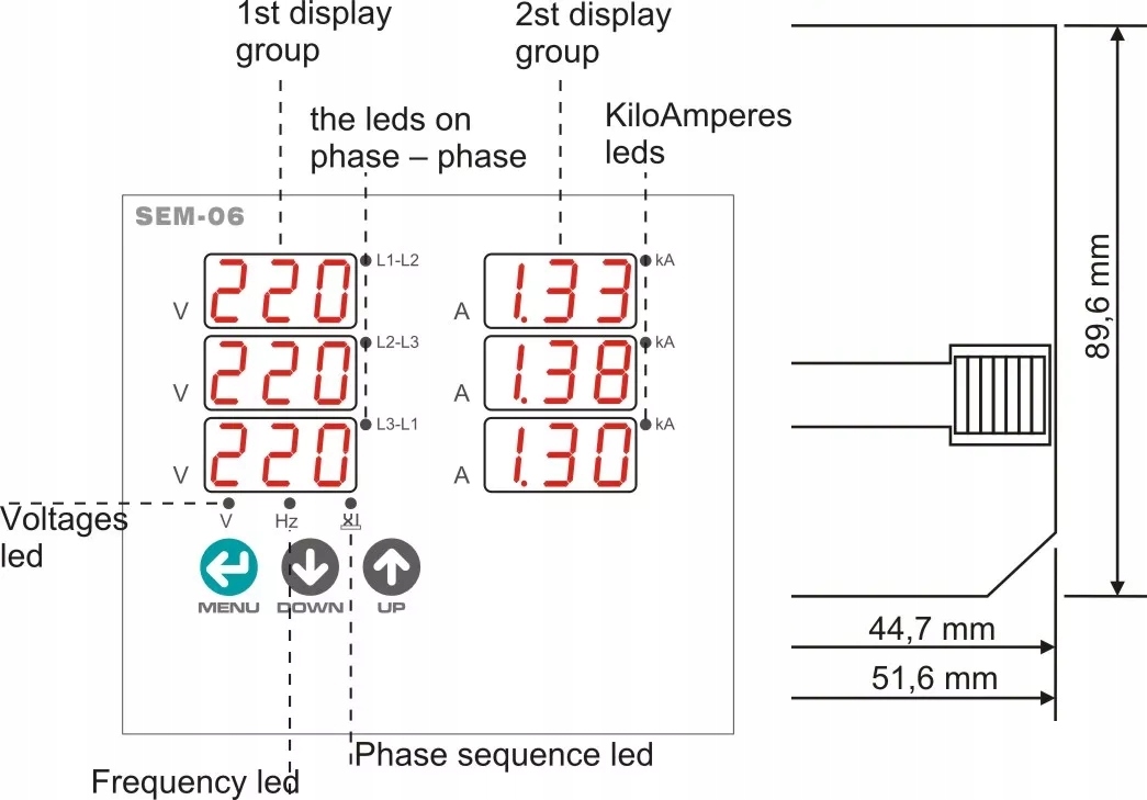 Цифровой индикатор напряжения 1–500 В переменного тока, ток 10–100 А, частота, чередование фаз 90x90