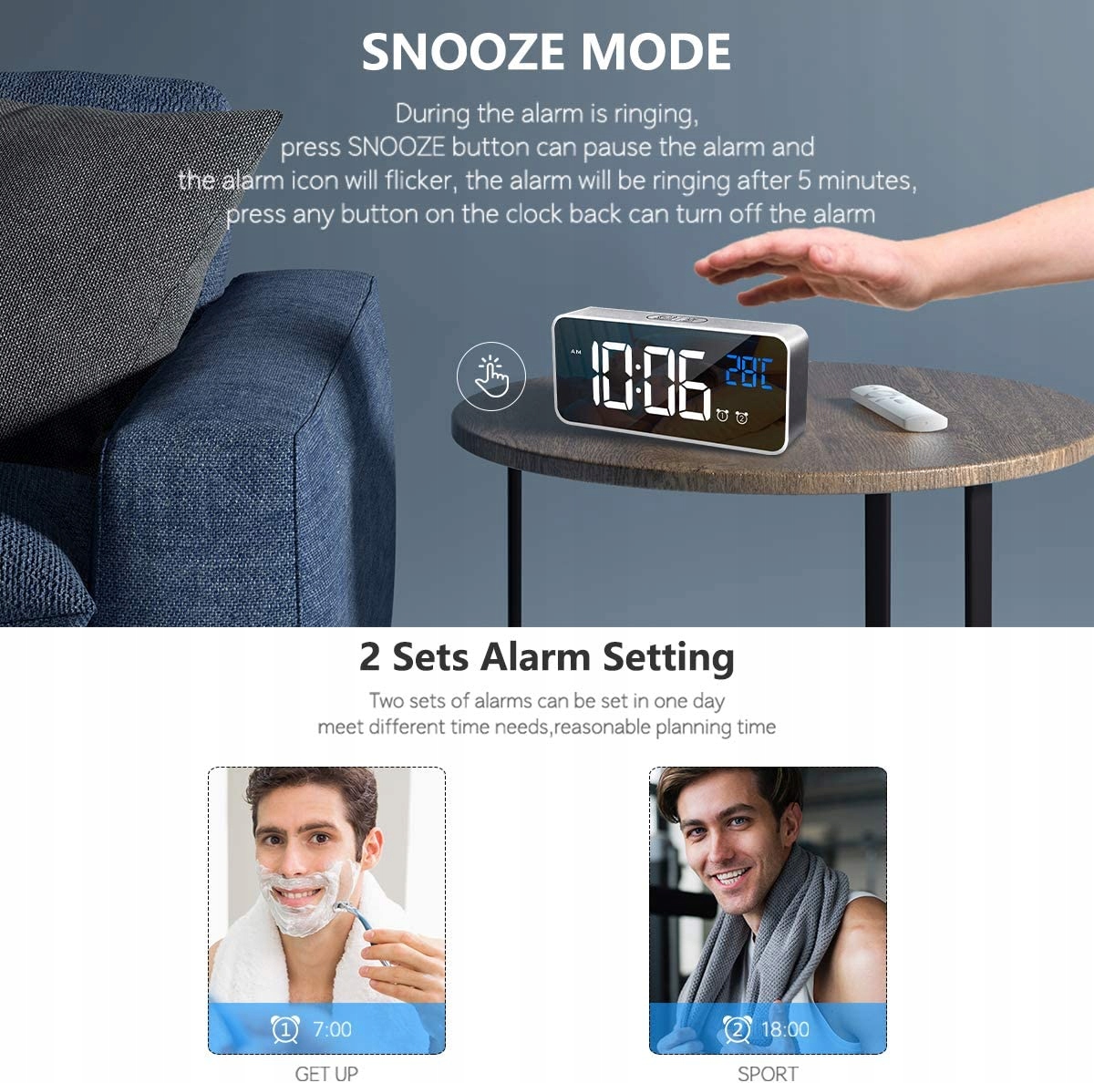 - Двойной будильник с функцией повтора С помощью двойного будильника вы можете установить два отдельных времени пробуждения. Возможность установить время повтора, нет необходимости вручную выключать будильник. Просыпайтесь в разное время, сделайте свою жизнь проще и комфортнее.