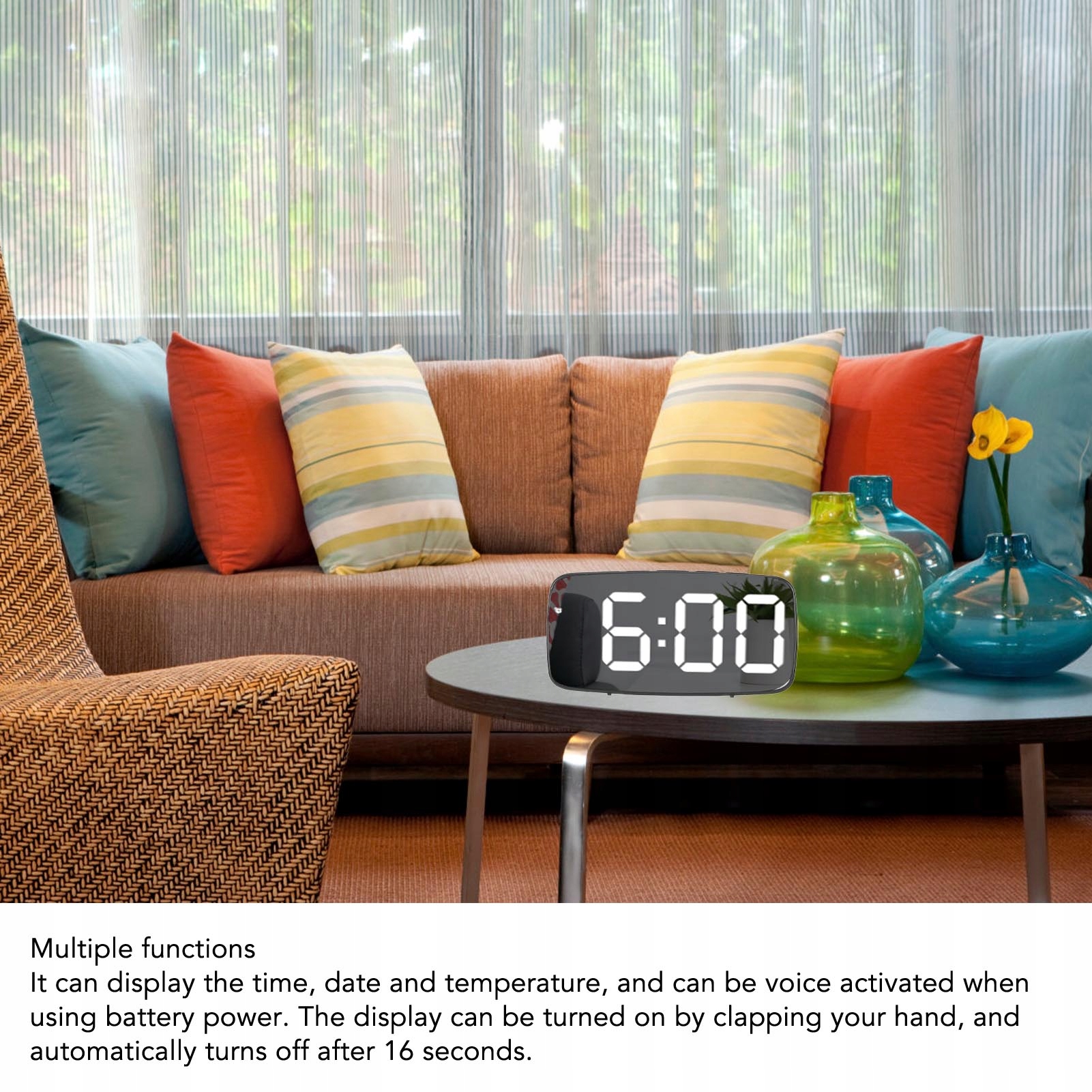 5. [Многократное использование]: часы могут отображать время, дату и температуру, а при питании от батареи их можно активировать голосом. Дисплей включается по хлопку в ладоши и автоматически выключается через 16 секунд.