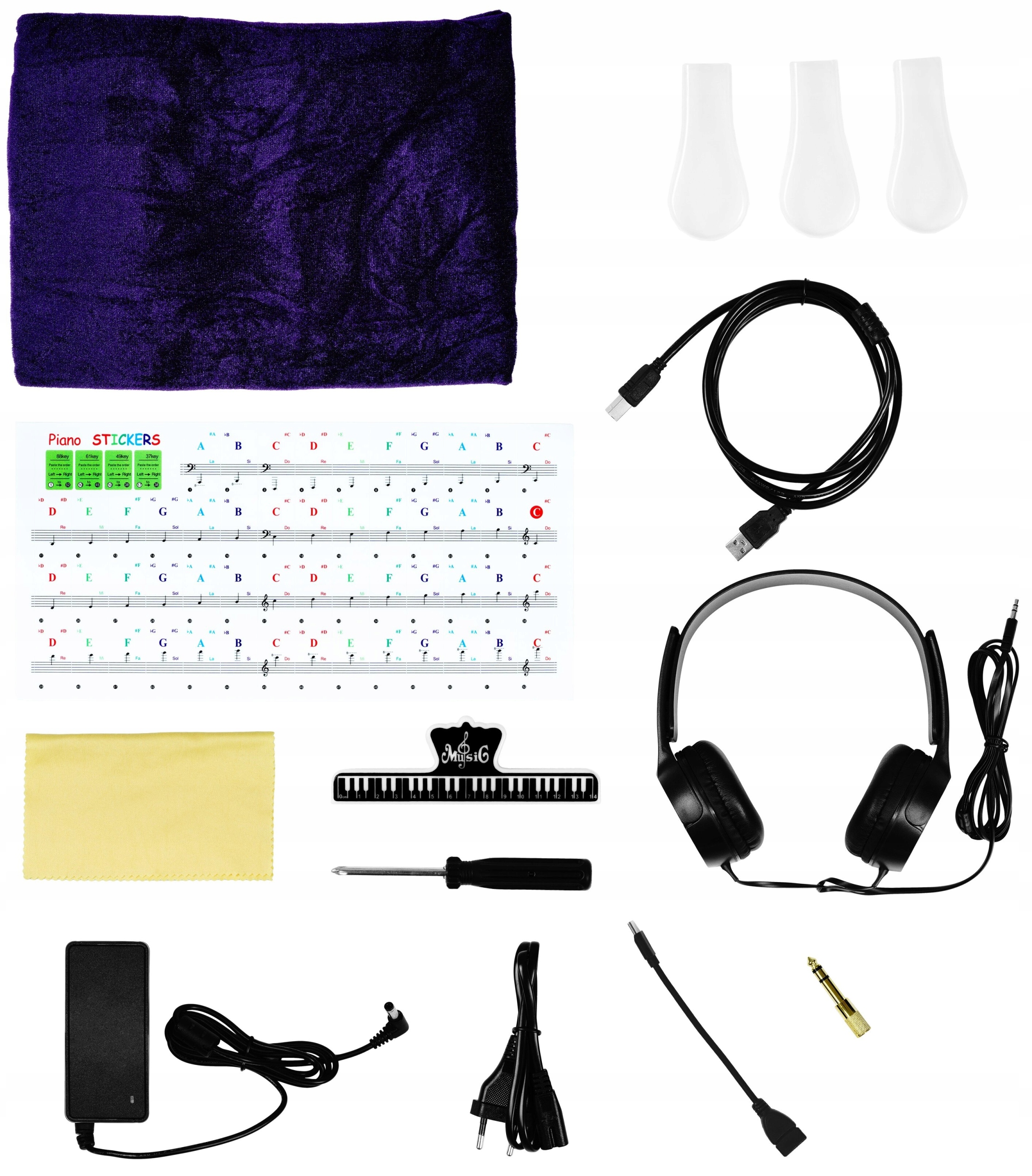 ✅ Digital piano Muscimate MM-P80-W Legacyline in white, network power supply, power cable, 3-function pedal, desktop for notes, Jack 3.5 mm wired headphones, velvet protective bedspread, notes to not 6.3 mm, OTG USB-A / USB-C cable, protective pedal covers, colorful stickers for keys with a notes of notes on the staff and letter designation facilitating game learning, документация.