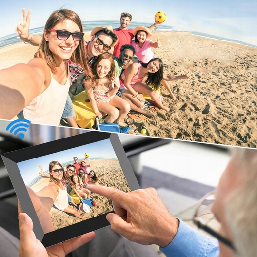 В приложении у вас есть возможность отправить фотографии с вашего телефона непосредственно на кадр. Кроме того, вы можете отображать и сделать свои фотографии/видео доступными для друзей по всему миру.