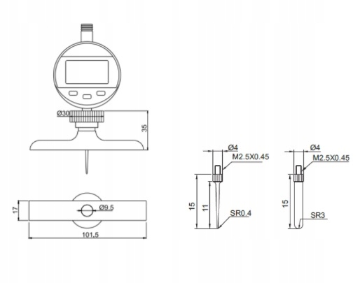 Электронный датчик глубиномера с диапазоном измерения 0-10 мм и разрешением 0,01 мм. Оснащен основанием размером 101,5х17 мм, изготовленным из нержавеющей стали. Устройство оснащено функцией изменения единиц измерения мм/дюйм и функцией ABS. Поставляется в комплекте с двумя насадками: круглой и игольной.