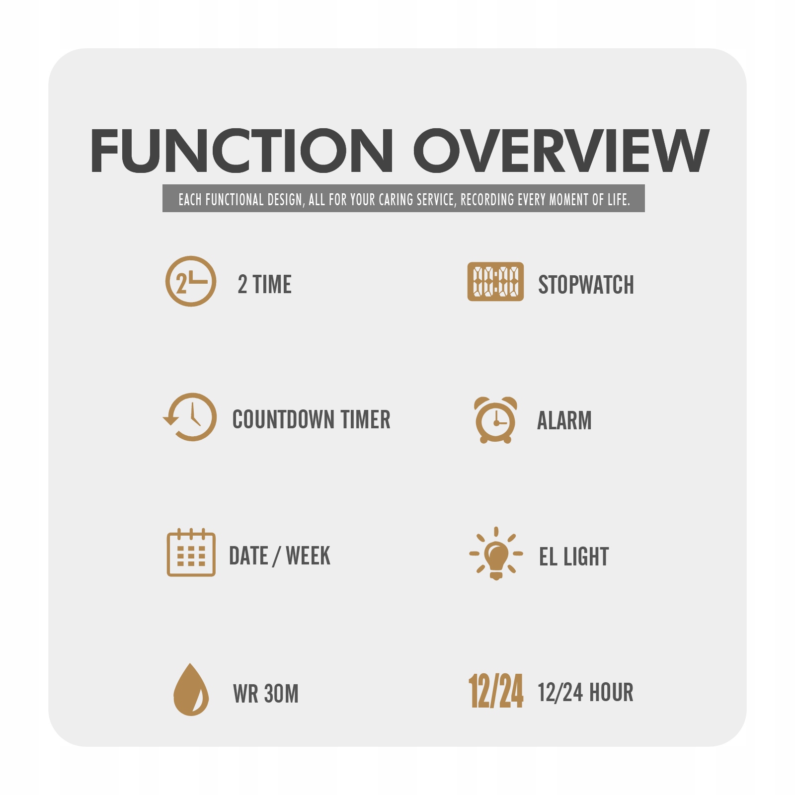 Функция: Двойное время, хронограф, будильник, дата, неделя, электролюминесцентная подсветка, 12/24-часовой формат, обратный отсчет