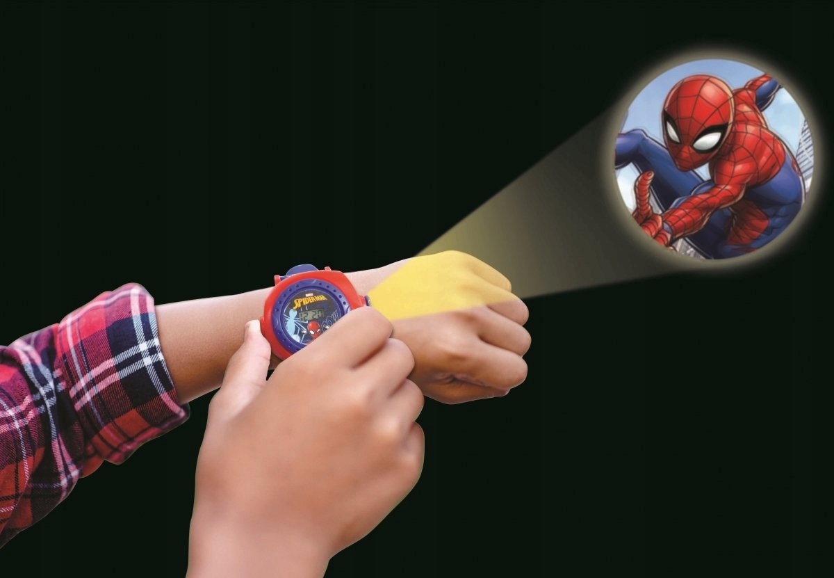 Идеальная идея подарка для каждого поклонника Человека-паука. Имеет встроенный проектор для отображения 24 цветных изображений. Для отображения изображений удерживайте кнопку на боковой стороне часов, затем поверните ручку, чтобы отрегулировать резкость отображаемых изображений. Он красного цвета с мотивом паутины. Проектор проецирует изображения на стену или потолок.