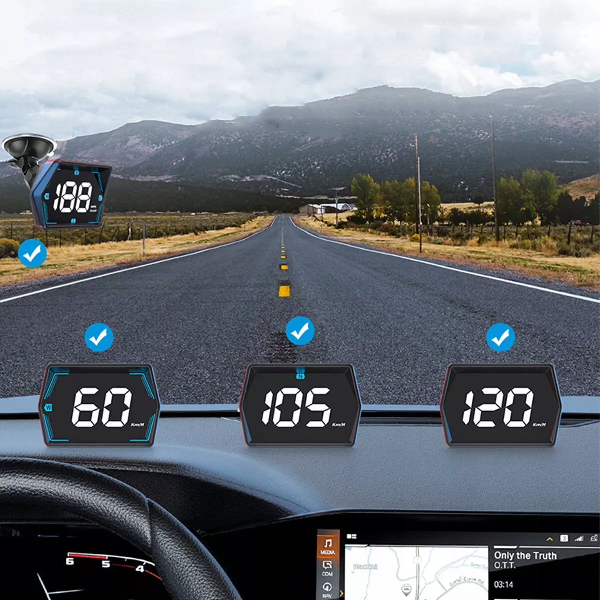 Благодаря размерам 77*53*18 мм Этот цифровой спидометр был разработан с небольшим корпусом, который подойдет в любом месте вашего автомобиля. Его компактный размер обеспечивает задачу без проблем и не покрывает вид во время вождения. Вы можете установить его на приборную панель с помощью ленты без скольжения или установить на лобовое стекло с помощью всасывающей чашки.
