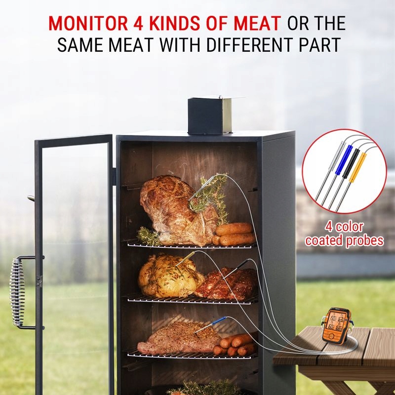 <р> В комплект входят четыре зонда из нержавеющей стали с цветовой маркировкой, которые можно использовать одновременно для ускорения или улучшения приготовления. Заостренная конструкция наконечника зонда и ЖК-дисплей с подсветкой обеспечить удобство использования. Если вас беспокоит температура прослужит дольше, чем вы ожидаете, устройство также оснащен часами, которые в нужный момент напомнят вам, что еда готова. Вам даже не придется беспокоиться о том, куда его положить. устройство, чтобы оно не запутывалось в пальцах. Сзади есть выдвижной подставка или непосредственно магнит, который просто крепится к грилю или холодильники.Четыре прецизионных датчика