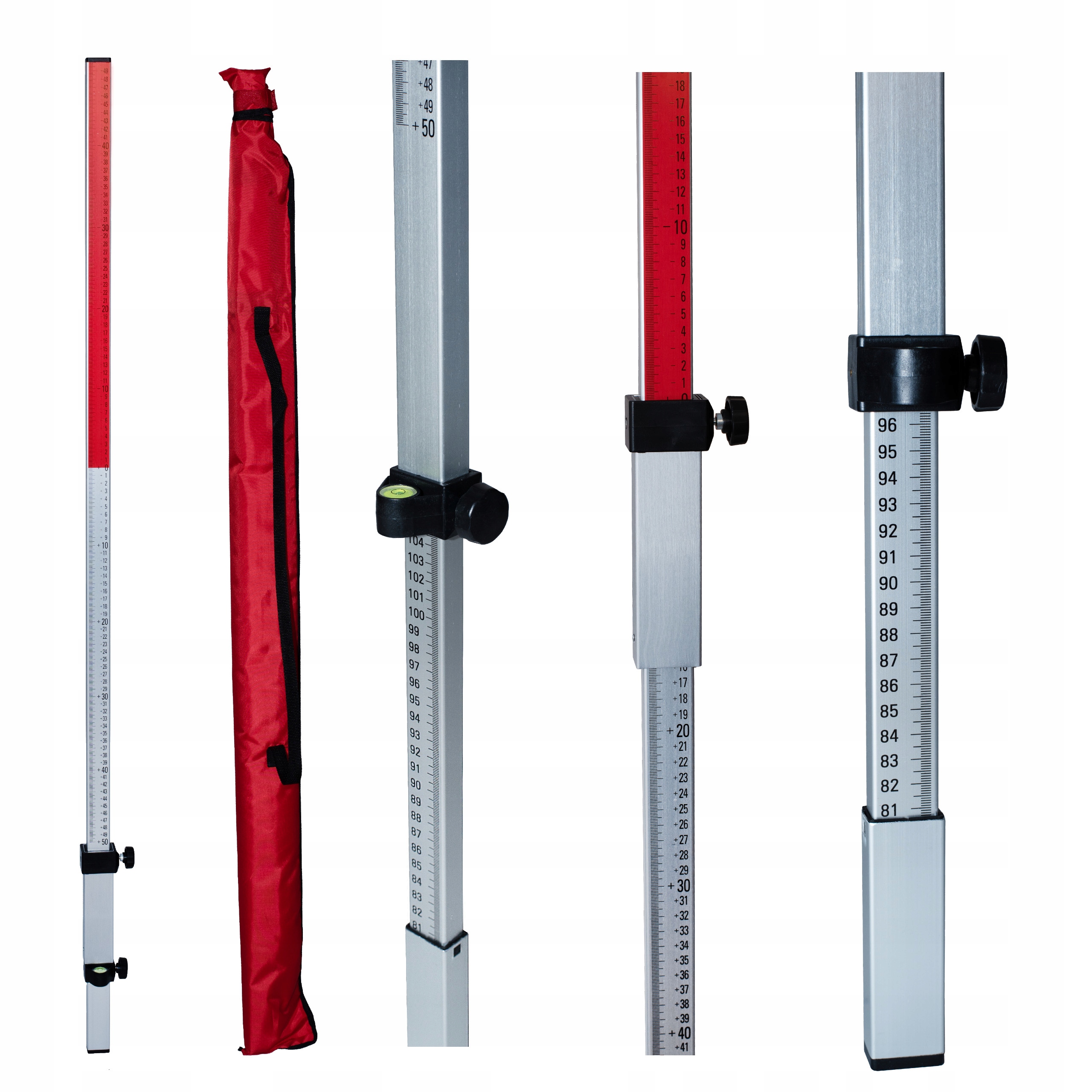 - Оснащен практичным ползунком для лазерного датчика и пузырьковым уровнем для точное нивелирование рейки.